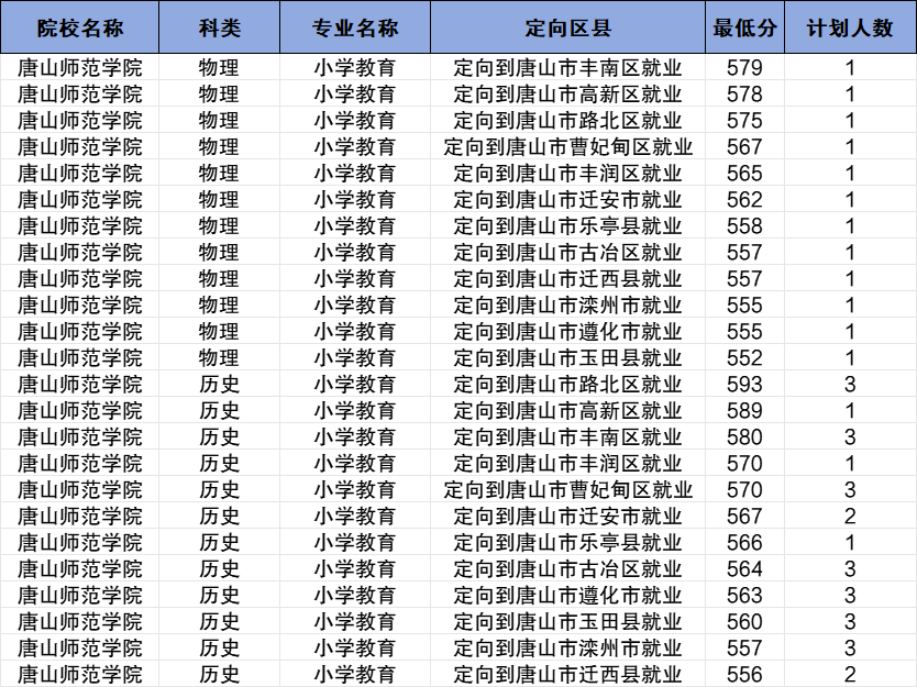 小学教育:历史最低分556分(迁西县),物理最低分552分(玉田县)。