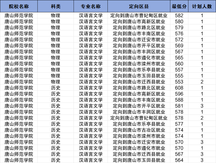 汉语言文学:历史最低分564分(玉田县),物理最低分553分(迁西县)。