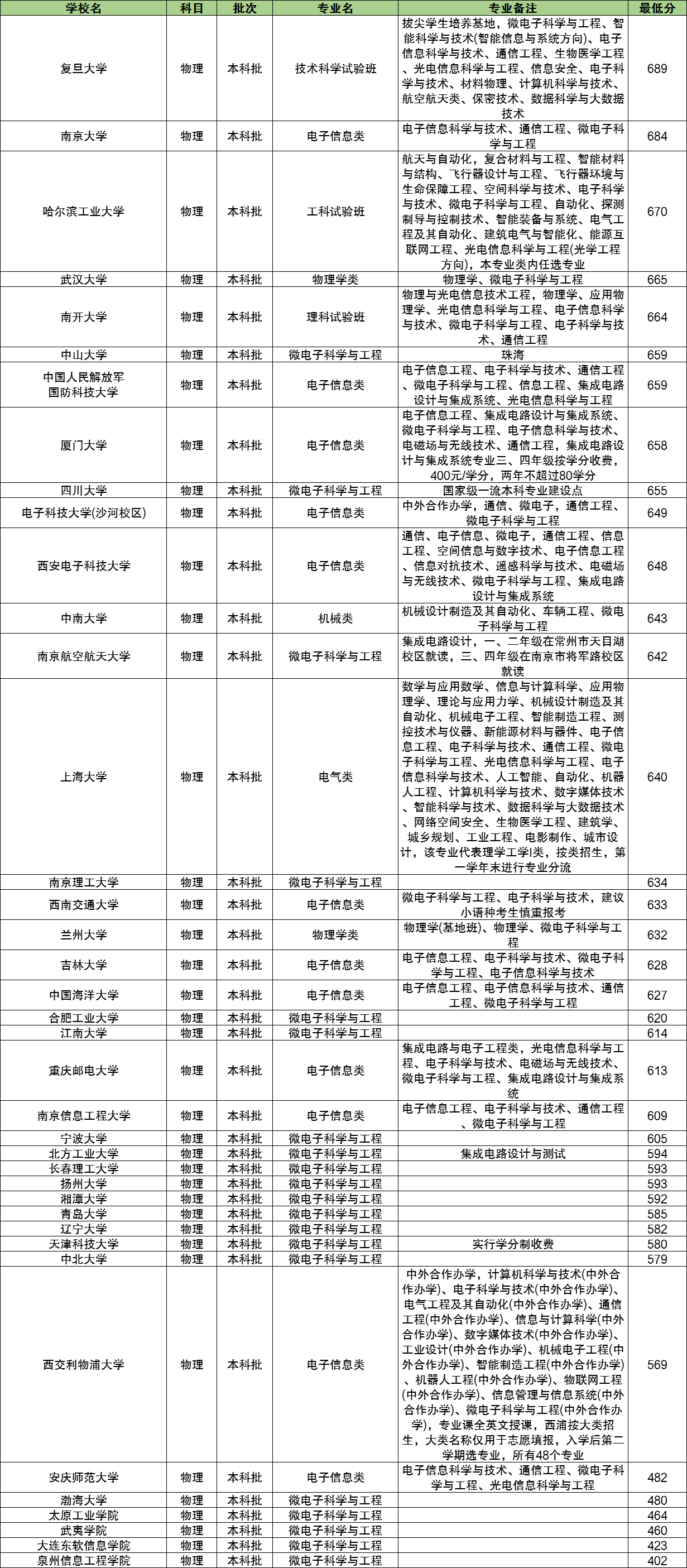 复旦大学:技术科学试验班(拔尖学生培养基地,微电子科学与工程、智能科学与技术(智能信息与系统方向)、电子信息科学与技术、通信工程、生物医学工程、光电信息科学与工程、信息安全、电子科学与技术、材料物理、计算机科学与技术、航空航天类、保密技术、数据科学与大数据技术),689分。
