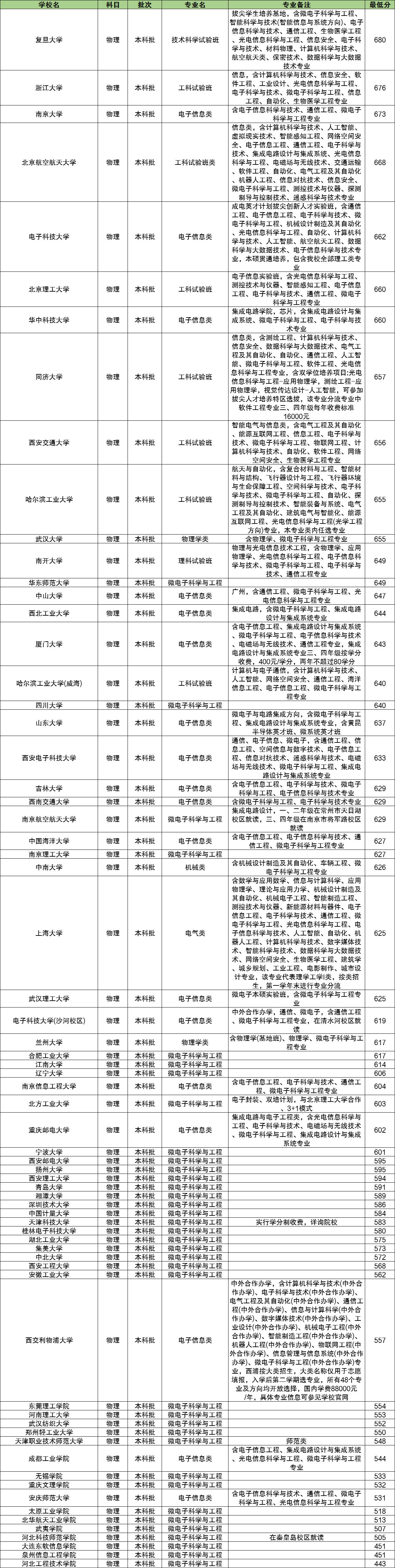 复旦大学:技术科学试验班(拔尖学生培养基地,含微电子科学与工程、智能科学与技术(智能信息与系统方向)、电子信息科学与技术、通信工程、生物医学工程、光电信息科学与工程、信息安全、电子科学与技术、材料物理、计算机科学与技术、航空航天类、保密技术、数据科学与大数据技术专业),680分。