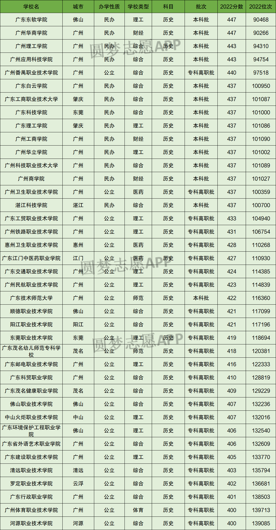 以下为2022年高考中广东省内文科400分到450分的大学名单。