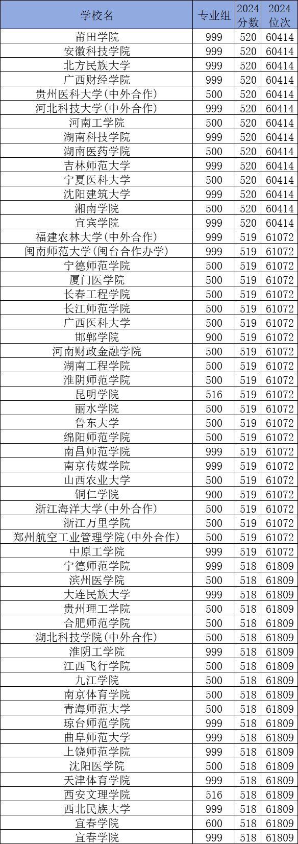 在这个范围内,录取分数线最高的是莆田学院999组、安徽科技学院999组等14个院校专业组,最低分为520分,最低位次60414位;