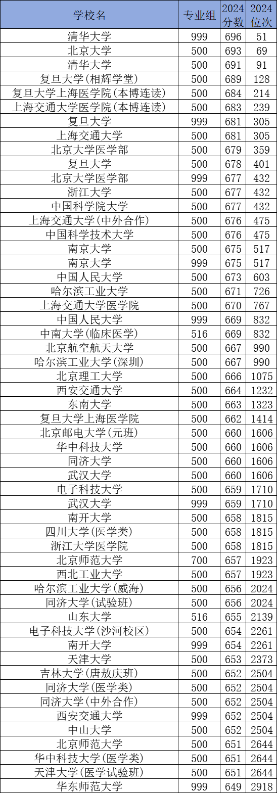在这个范围内,录取分数线最高的是清华大学999组,最低分为696分,最低位次51位;