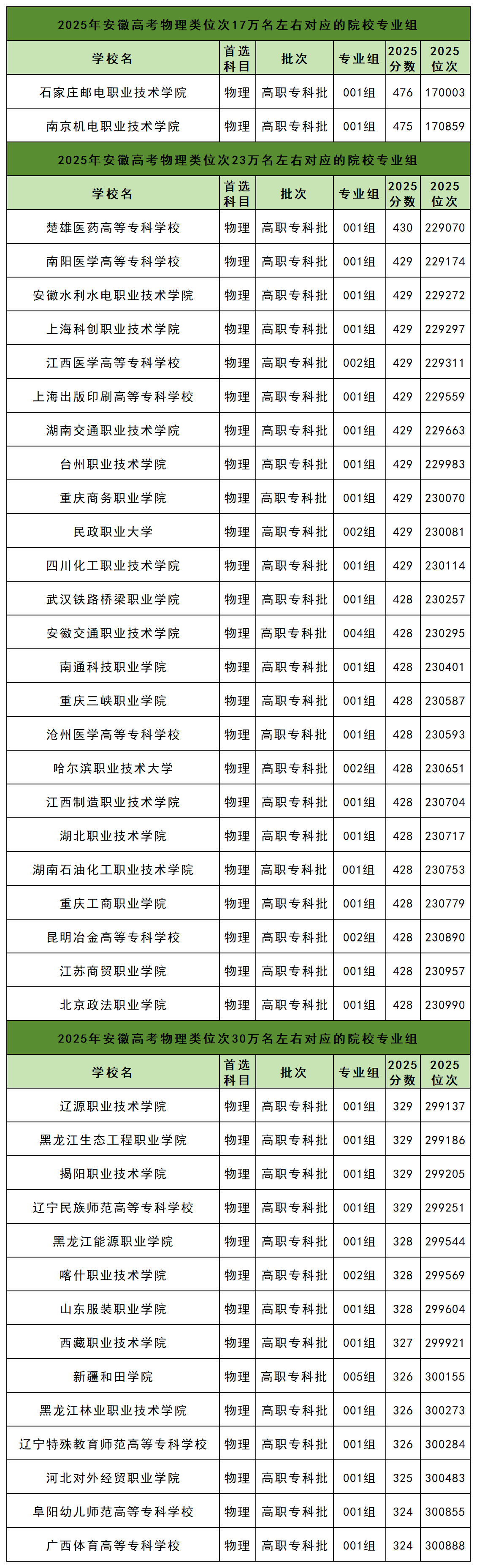 以物理类数据为例,2026年安徽考生位次在320647名以内有机会就读公办专科院校,排名对应学校为钦州幼儿师范高等专科学校;2026年安徽考生位次在256696名以内有机会就读公办本科院校,排名对应学校为太原学院。