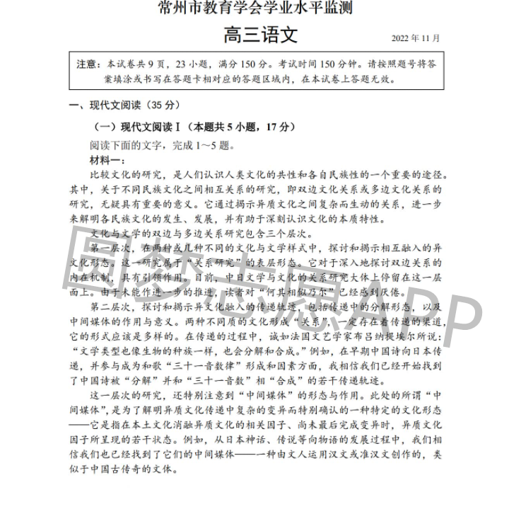 2023常州市高三上学期期中考试将于2022年11月2日开考,考试结束后本文将更新2023常州市高三上学期期中考试语文答案及试卷,下文为小编搜集整理的2023常州市高三上学期期中考试语文试题及参考答案,供大家参考。