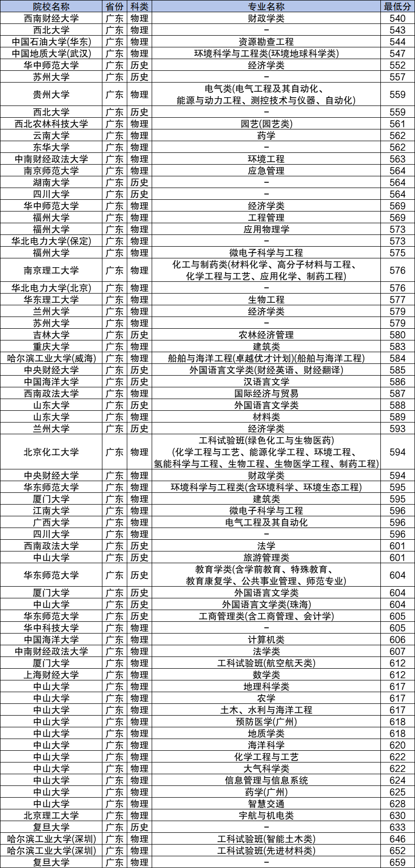 2024年广东高校专项计划物理类录取分数线540分到659分之间,分数线最低的是西南财经大学财政学类专业、分数线最高的是复旦大学。