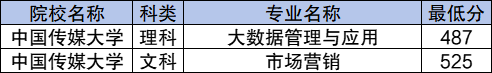 学校国家专项计划文科最低分数线是525分,对应的招生专业是市场营销;理科最低分数线是487分,对应的招生专业是大数据管理与应用。