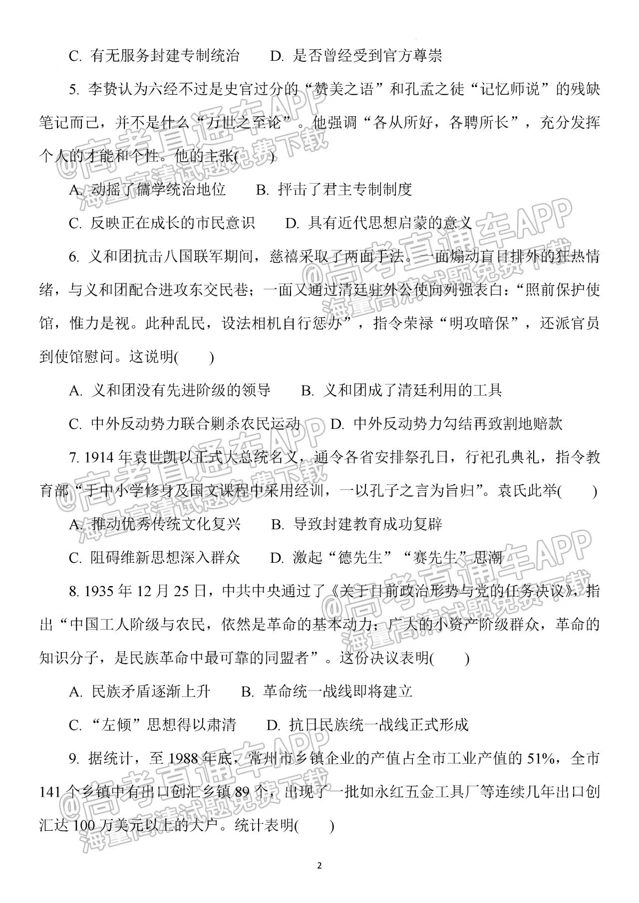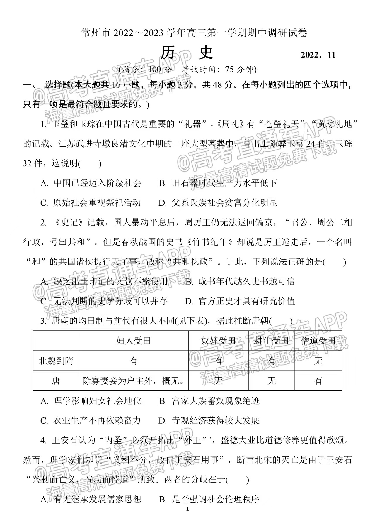 2023常州市高三上学期期中考试将于2022年11月2日开考,考试结束后本文将更新2023常州市高三上学期期中考试历史答案及试卷,下文为小编搜集整理的2023常州市高三上学期期中考试历史试题及参考答案,供大家参考。