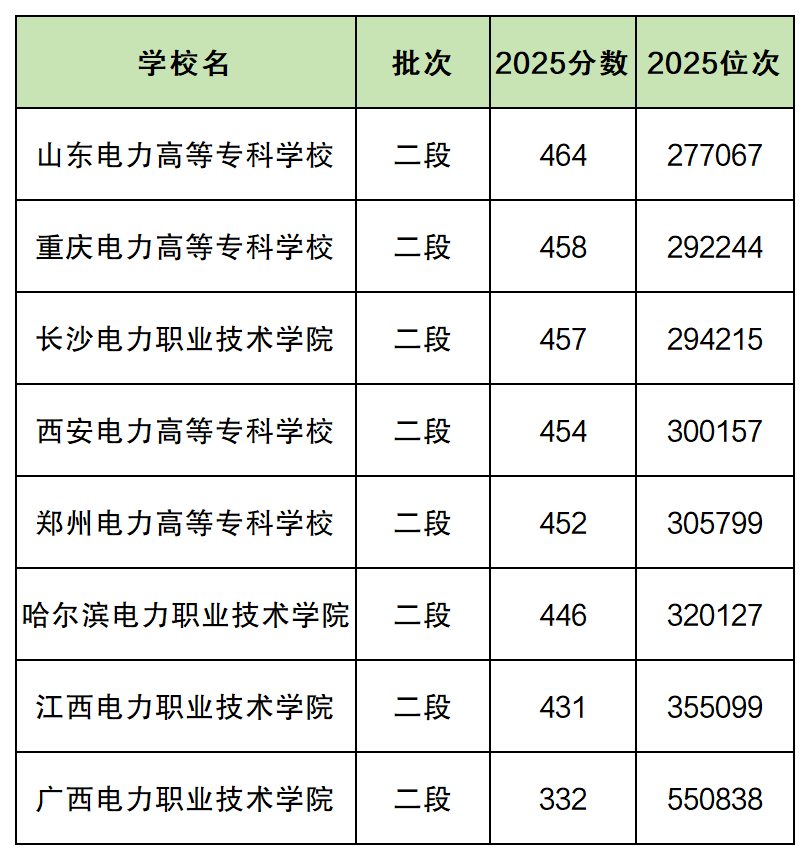在山东省录取分数在464分~332分之间。山东电力高等专科学院在山东高考二段录取分数最高,对应分数为464分,位次在277067名;广西电力职业技术学院录取分数较低,分数为332分,位次在550838名。