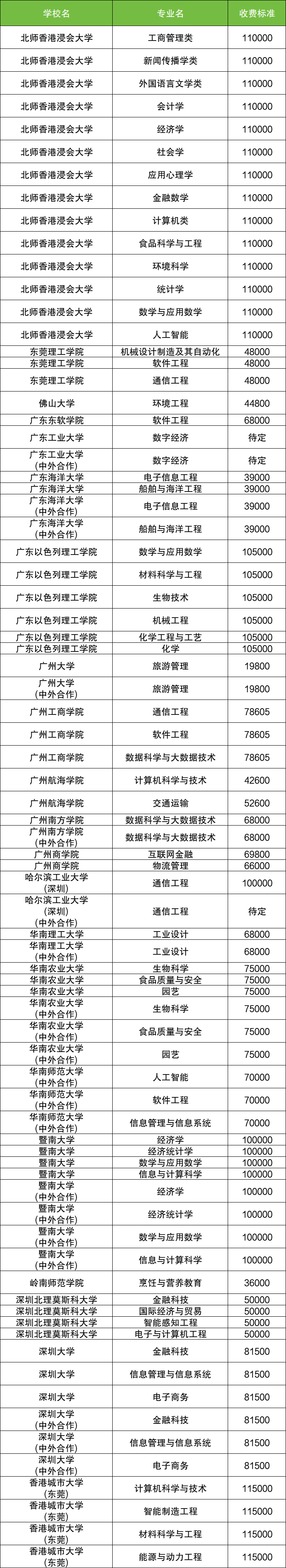 注:以上为广东省中外合作办学项目的学费标准,具体收费以各学校当年公布的招生章程为准。标注"待定"的专业请咨询相关学校招生办。