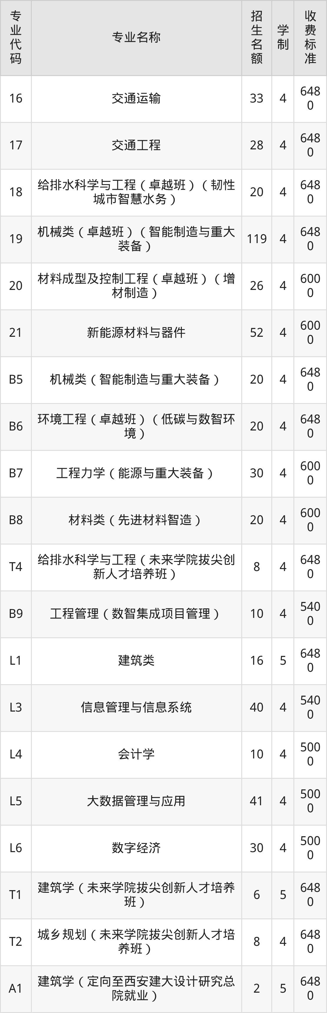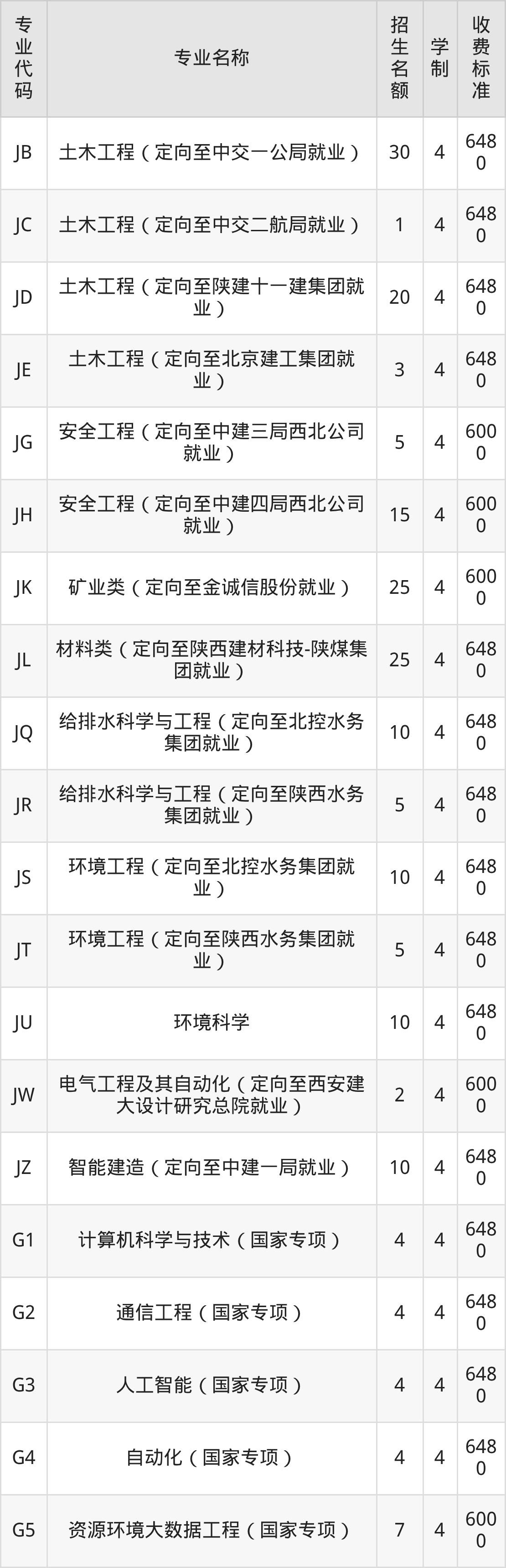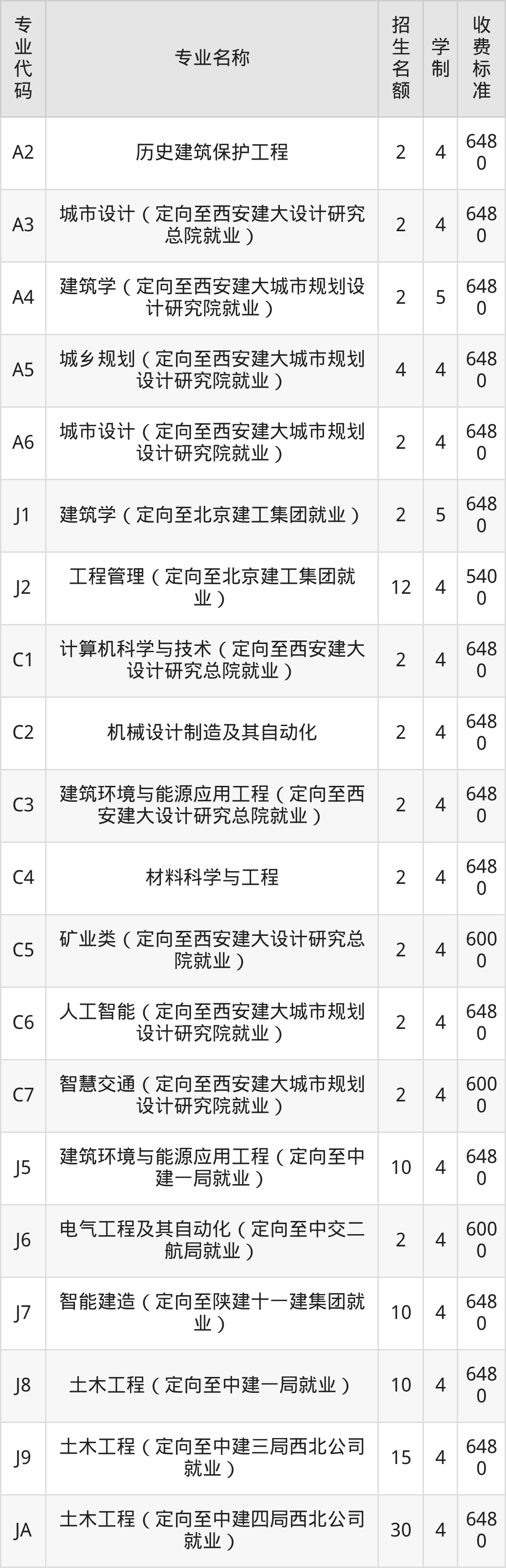 西安建筑科技大学建筑学专业在本科批历史类招2人,学制5年,专业招生代码是TA,学费是6480元一年。西安建筑科技大学城乡规划专业在本科批历史类招2人,学制4年,专业招生代码是TB,学费是6480元一年。