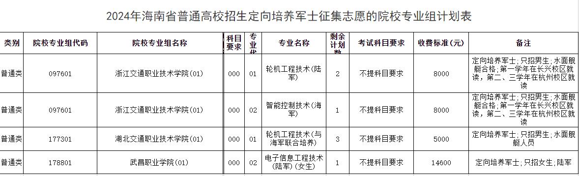 2024年江苏专科提前批次中的定向军士征集补录院校只有一所,为武汉交通职业学院(航海技术,只招物理类男生)。