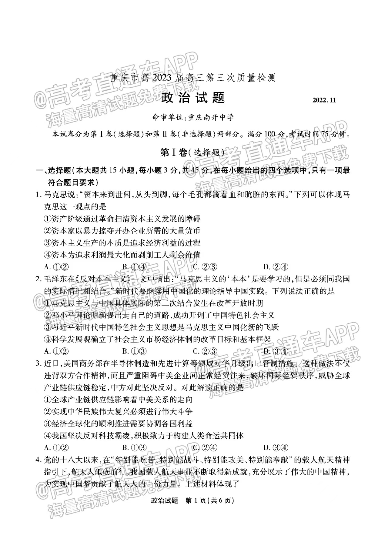 一、2023重庆高三联考政治试卷
