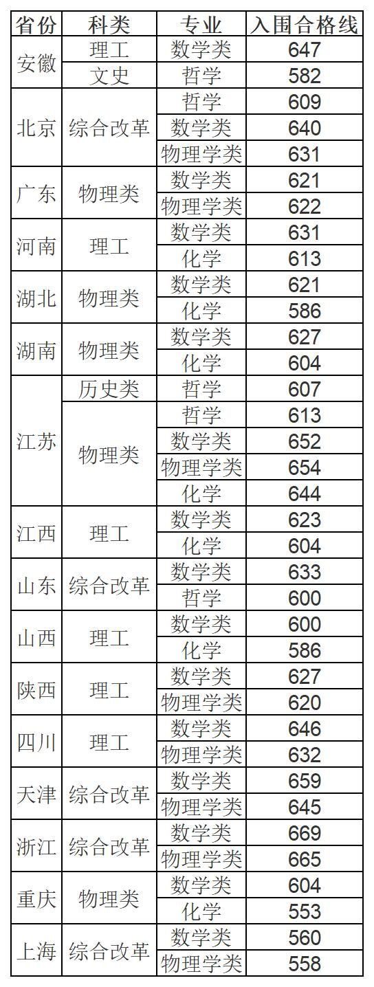 学校面向全国多个省市的强基计划入围分数线整理如下,供2024届考生参考: