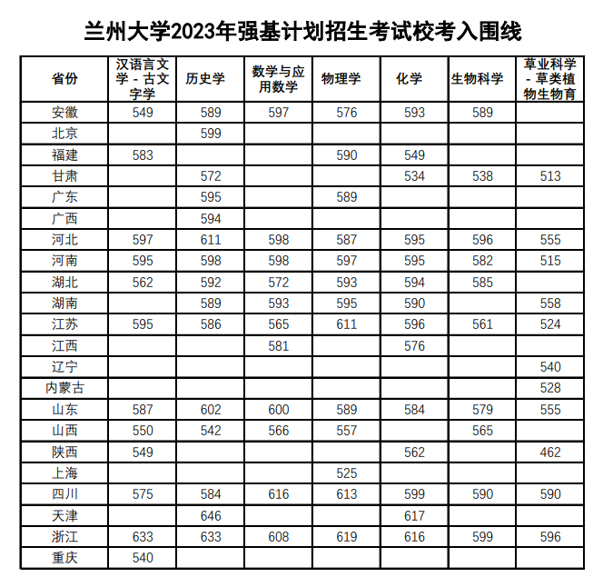 2023年兰州大学共有7个学科专业在强基计划中面向全国各省市进行招生,我们整理出了学校各专业的高考入围分数线,供24届考生参考。