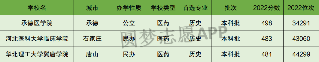 在河北文科考生中400-500分上的医科大学有承德医学院、河北医科大学临床学院、华北理工大学冀唐学院,共计3所,均为本科大学。