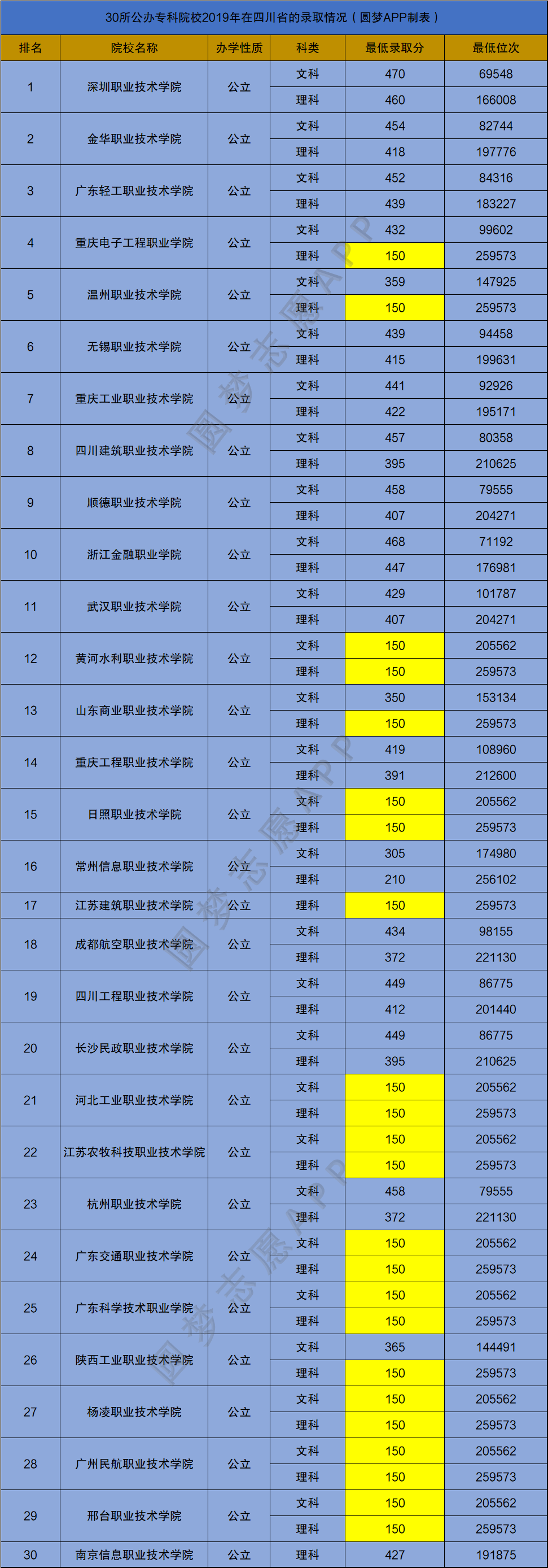 由此可知,2019年四川省的文科生和理科生高考只要考到150分,达到四川省专科控制分数线(150分),即可考上全国排名前40的专科院校。
