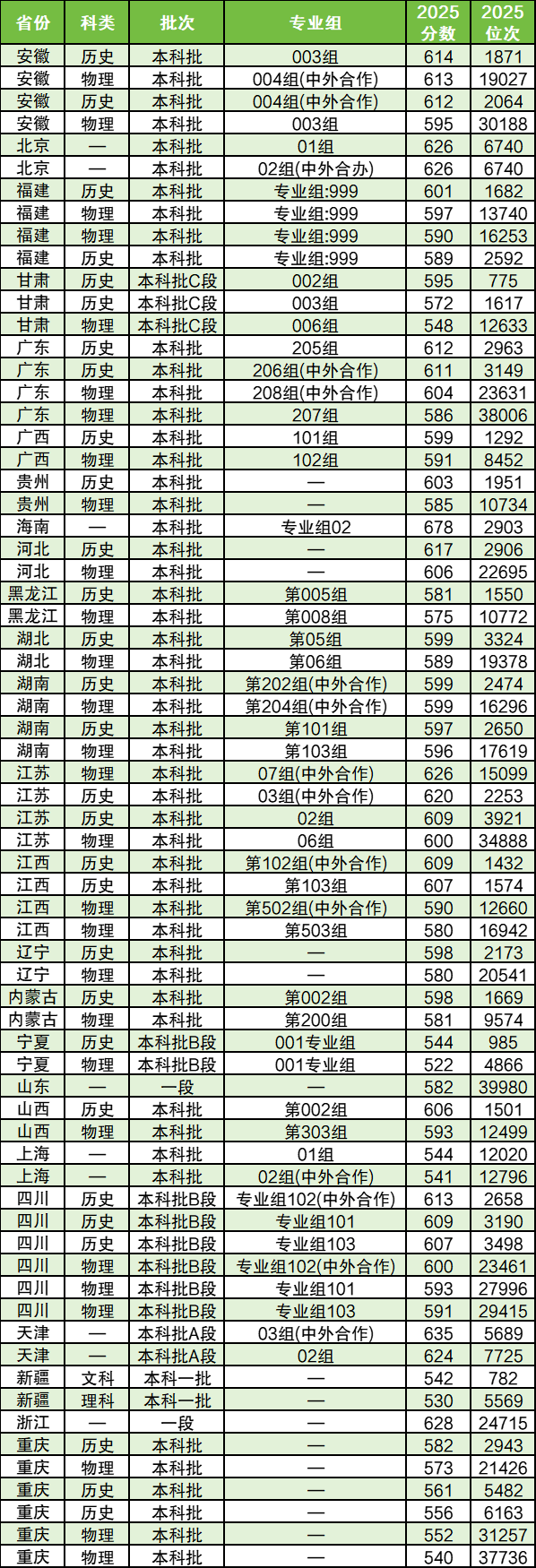 下面是其2025年在部分省份的最低分数情况: