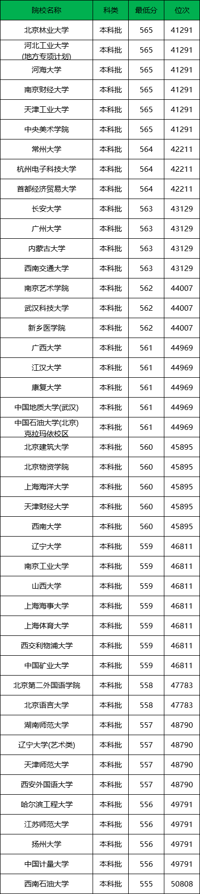 北京林业大学(565分)、河海大学(565分)、长安大学(563分)、西南大学(560分)。