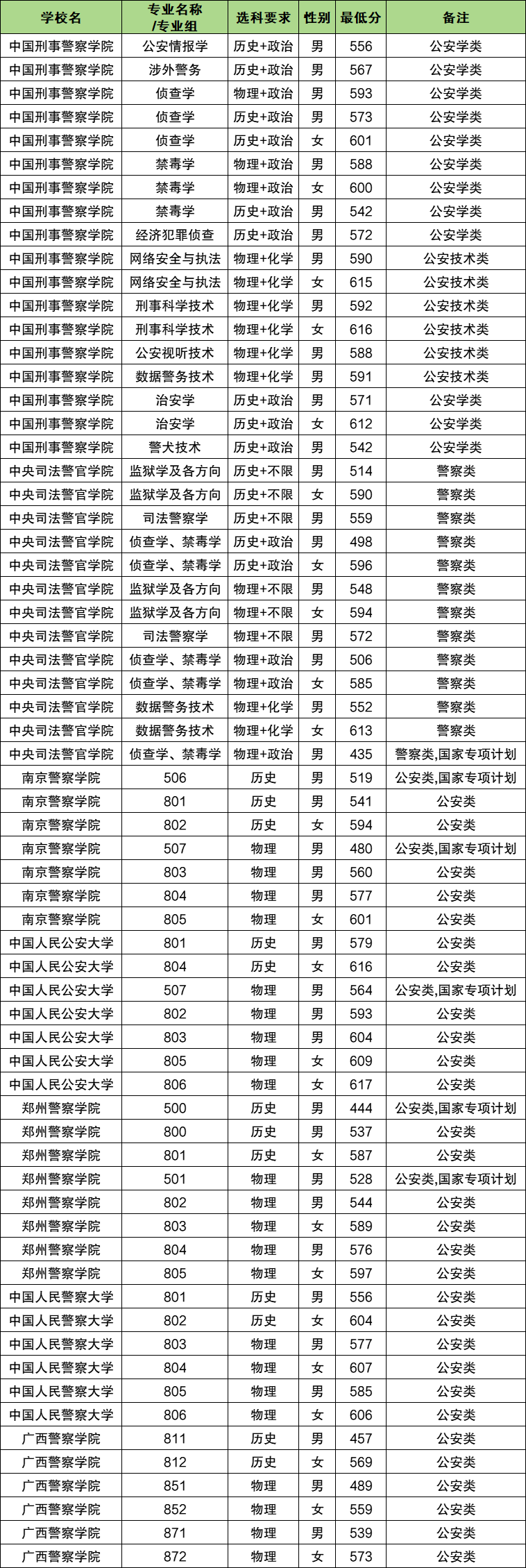 2025年在广西物理组招生的警校录取分数线范围是435分到617分,收分最低的学校为中央司法警官学院,2025年男生最低分435分;收分最高的学校为中国人民公安大学,2025年女生最低分617分,对应806专业组。