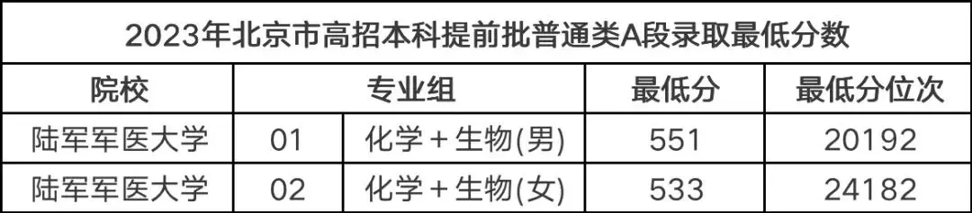 2023年陆军军医大学在北京市本科提前批专业01组化学+生物(男)的最低录取分数为551分,最低分位次为20192名;专业组02组化学+生物(女)的最低录取录取分数为533分,最低分位次为24182名。