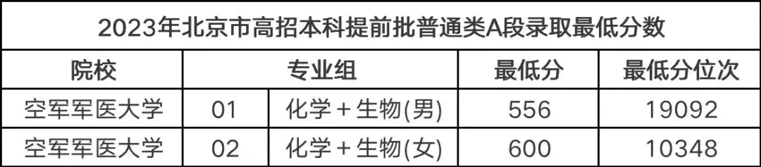2023年空军军医大学在北京市本科提前批专业01组化学+生物(男)的最低录取分数为556分,最低分位次为19092名;专业组02组化学+生物(女)的最低录取录取分数为600分,最低分位次为10348名。