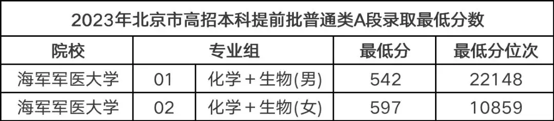 2023年海军军医大学在北京市本科提前批专业01组化学+生物(男)的最低录取分数为542分,最低分位次为22148名;专业组02组化学+生物(女)的最低录取录取分数为597分,最低分位次为10859名。