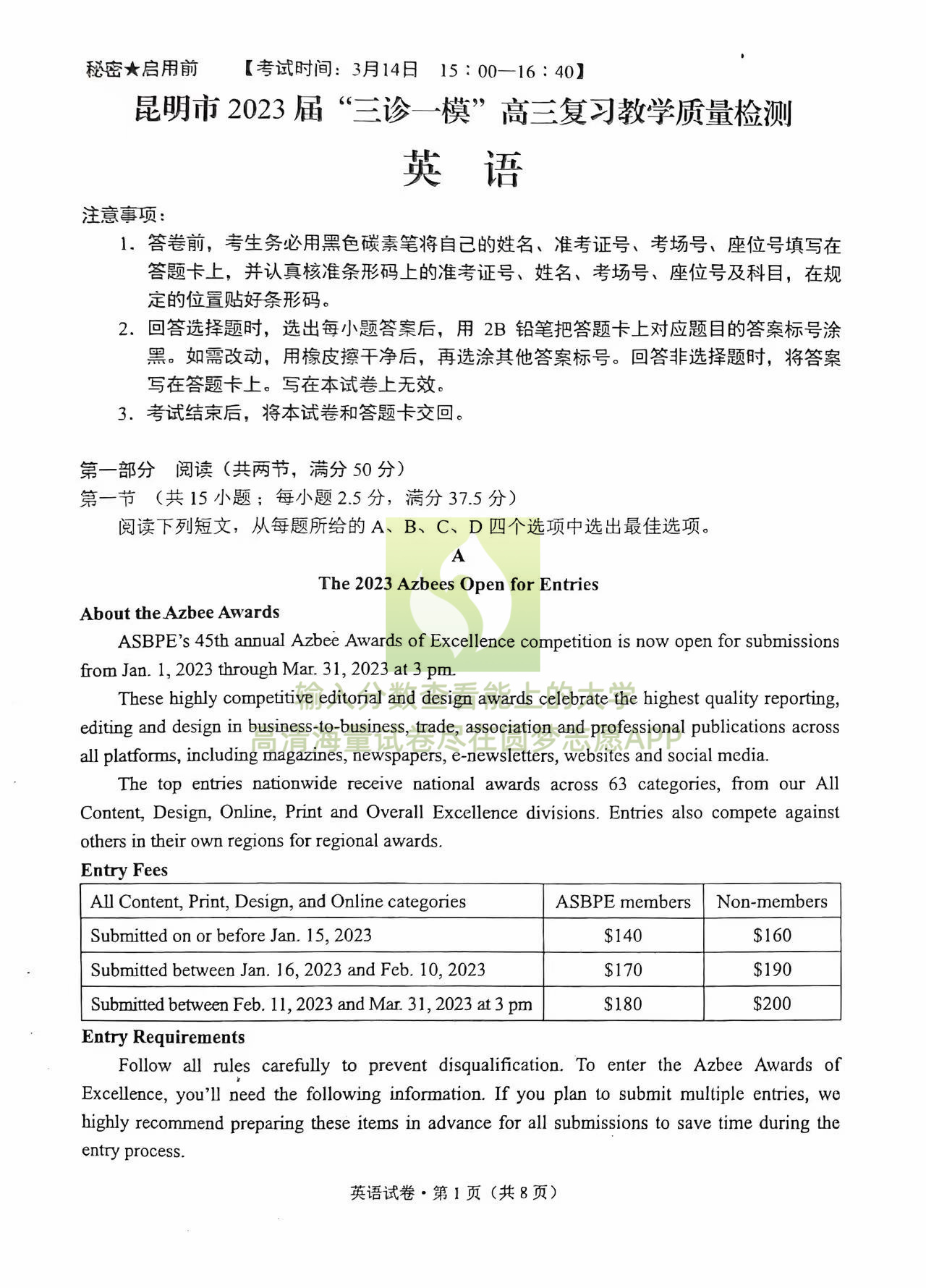 以下为2023昆明三诊一模三月统测各科试卷及参考答案汇总: