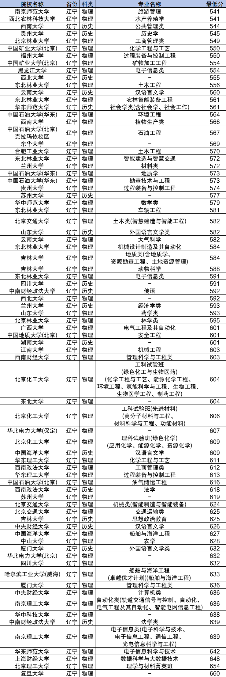 2024年辽宁高校专项计划物理类录取分数线541分到660分之间,分数线最低的是南京师范大学旅游管理专业、西北农林科技大学水产养殖学专业,分数线最高的是复旦大学。