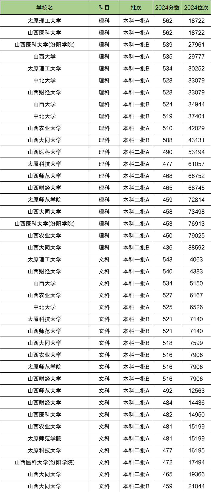 根据山西省2024年高考录取分数线,本文整理出了山西省前十名大学在文科和理科的最低录取分数线,以供考生和家长参考。
