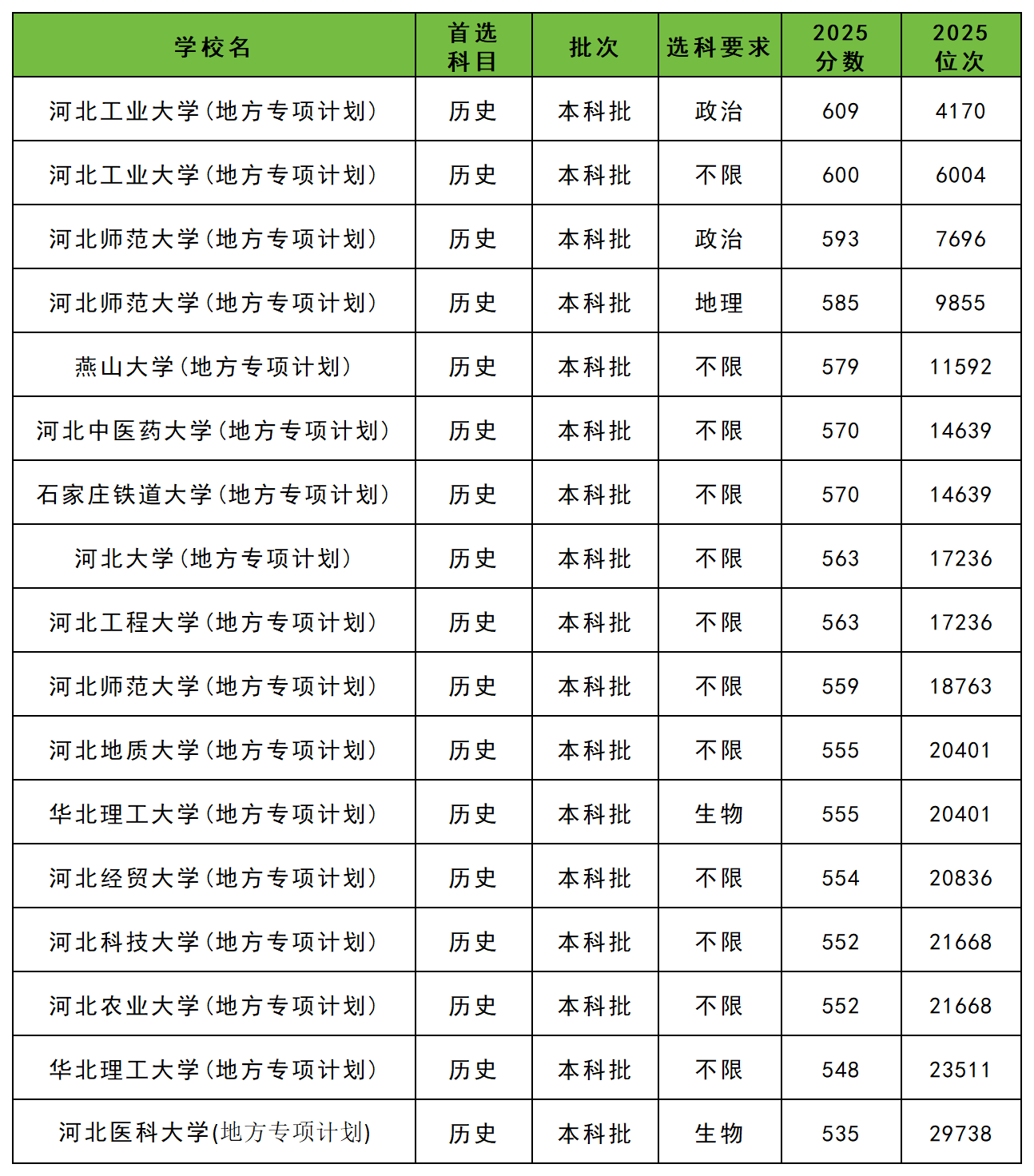 2025年河北地方专项历史类录取分数线位于535分到609分之间,各学校最低分如下。