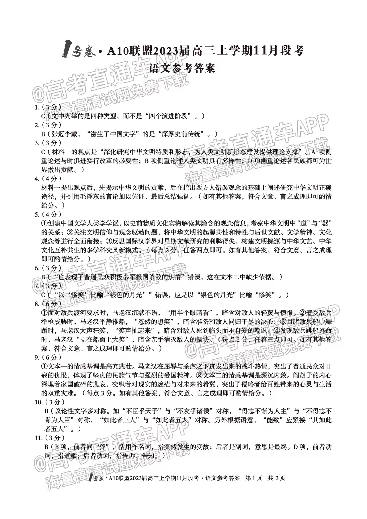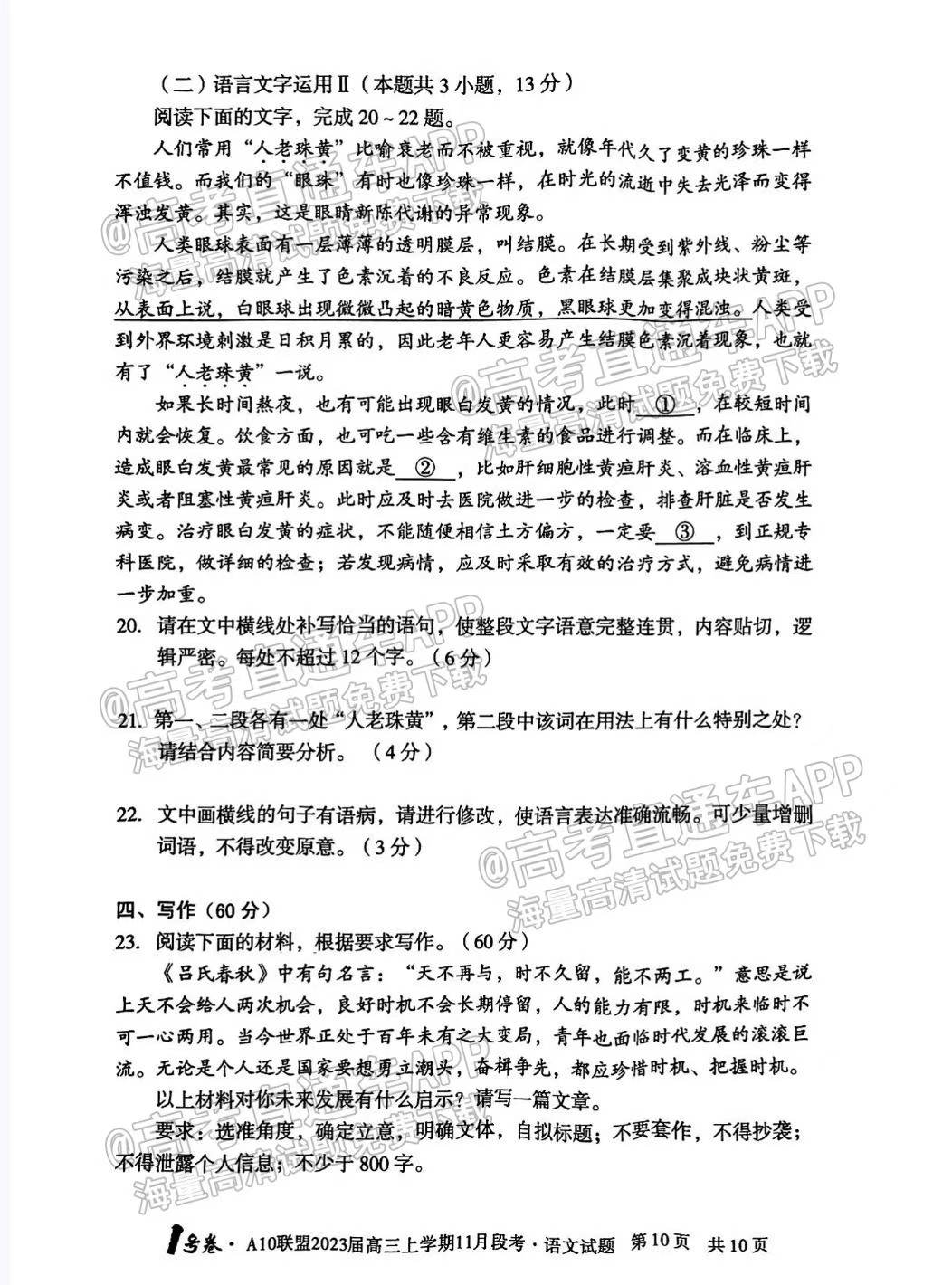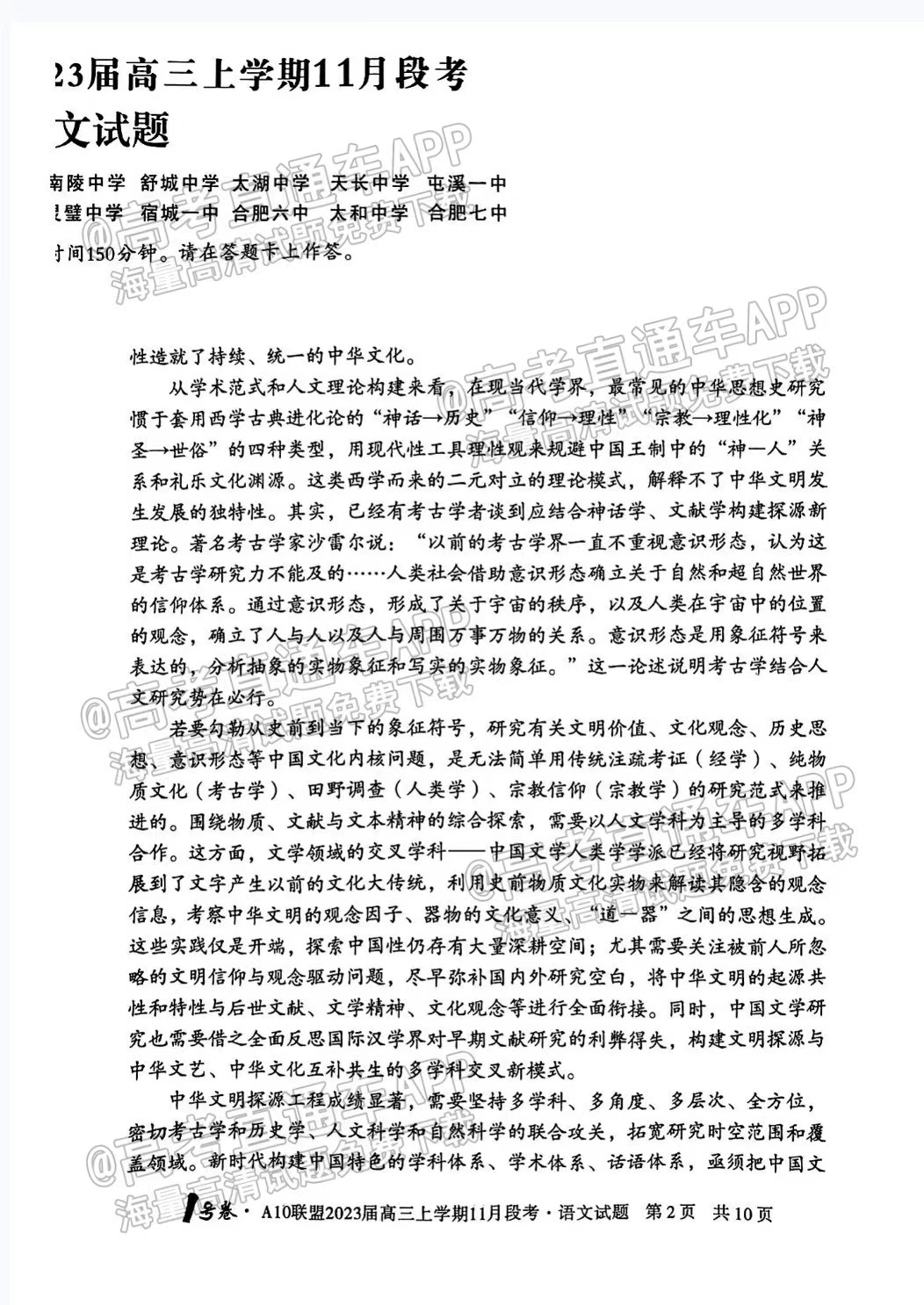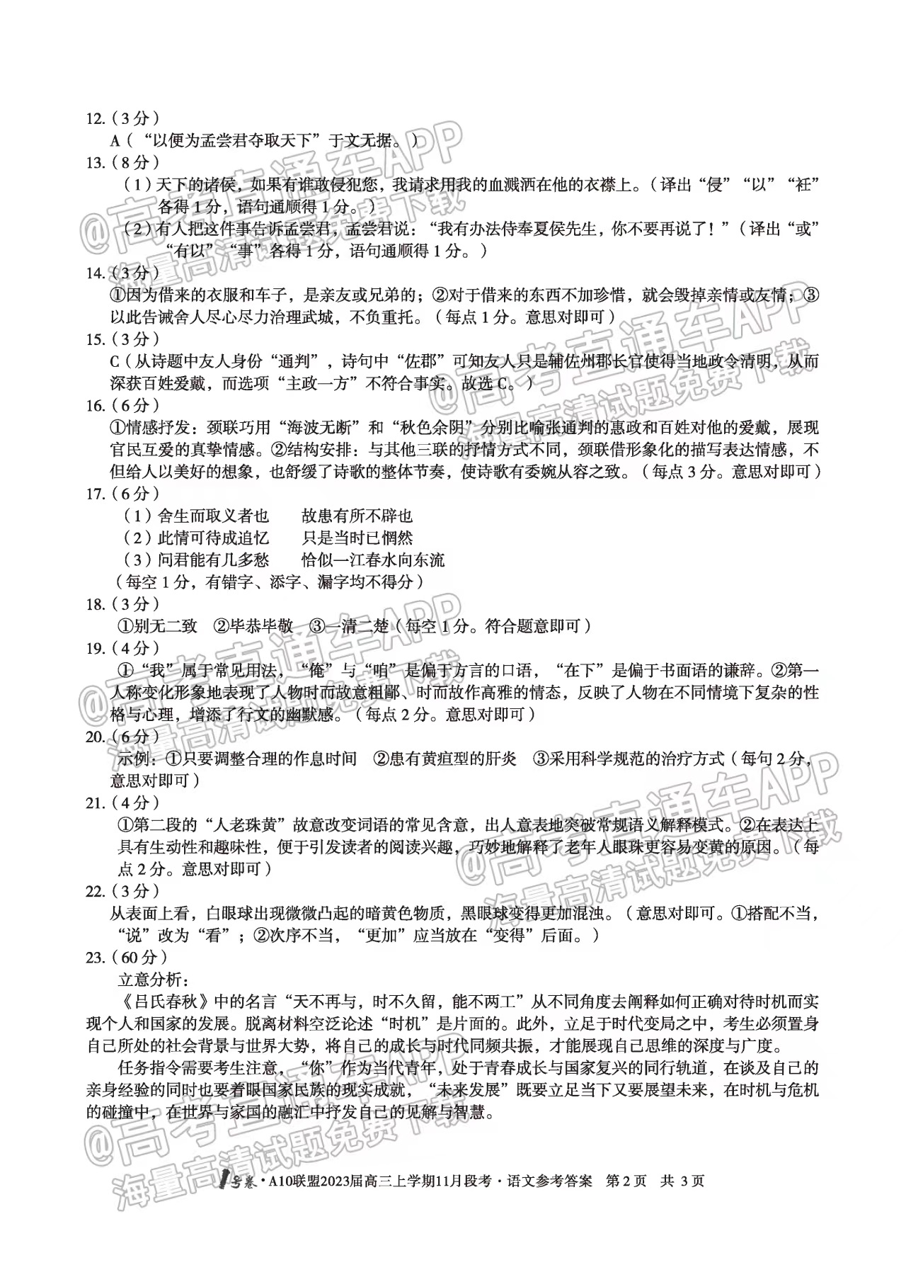 二、2023安徽A10联盟高三11月段考语文答案汇总