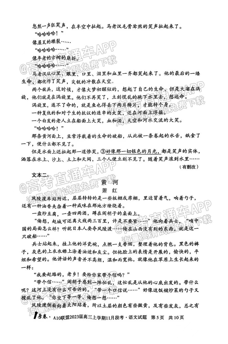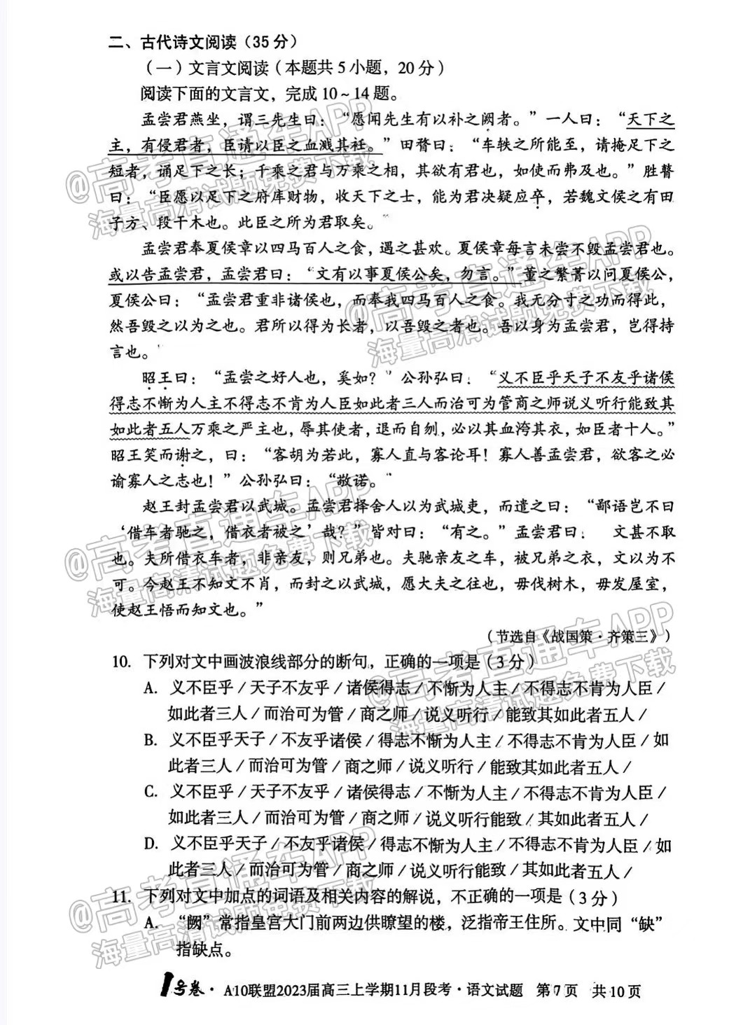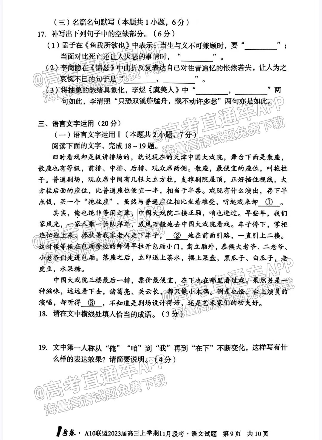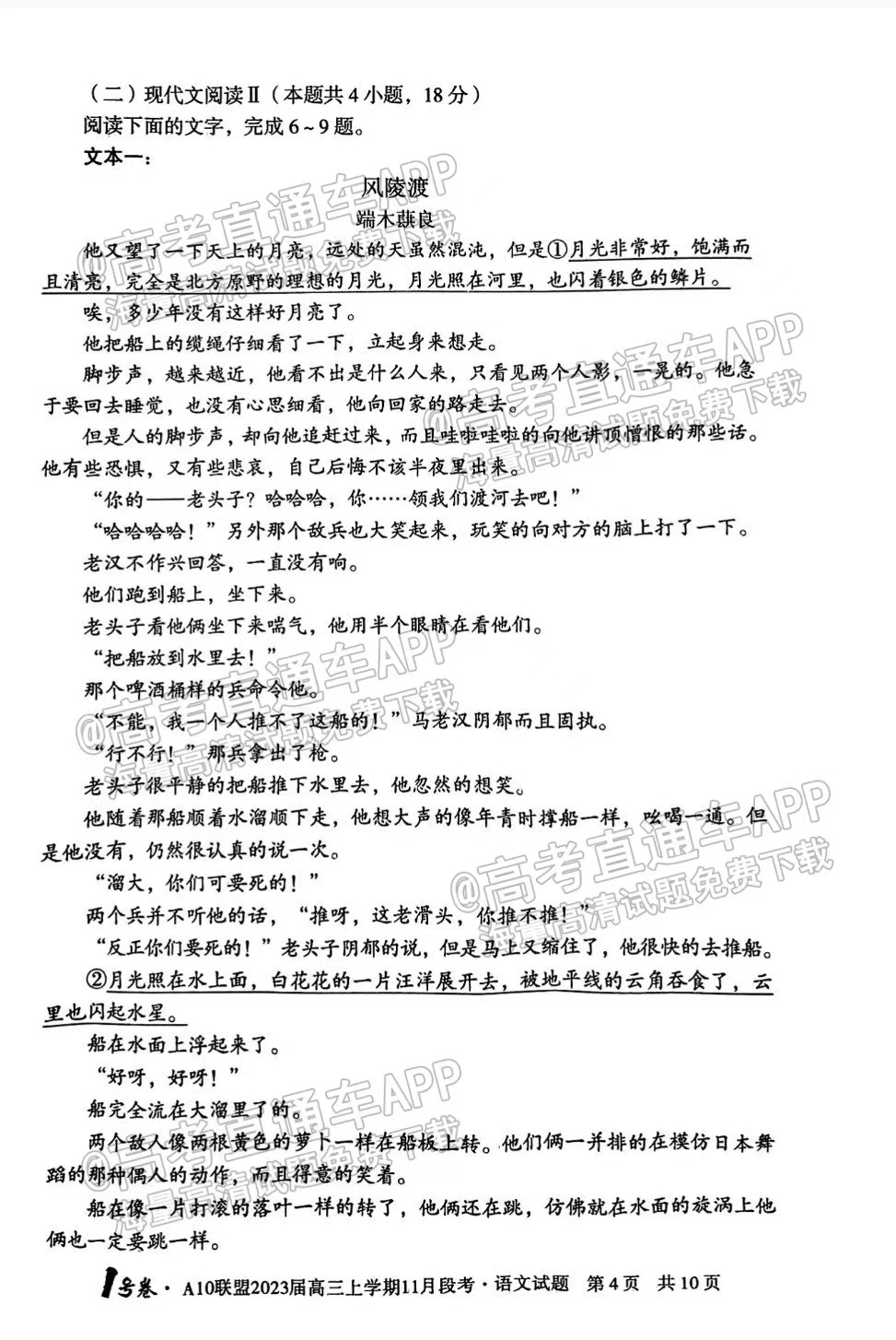 一、2023安徽A10联盟高三11月段考语文试卷