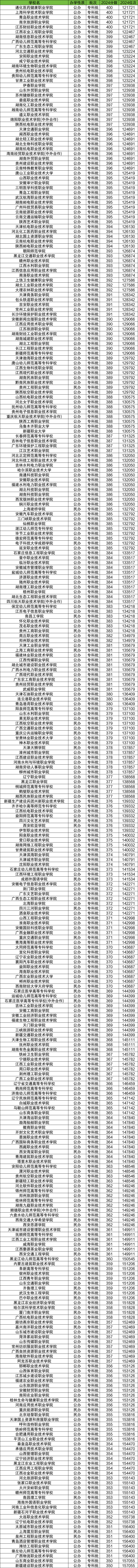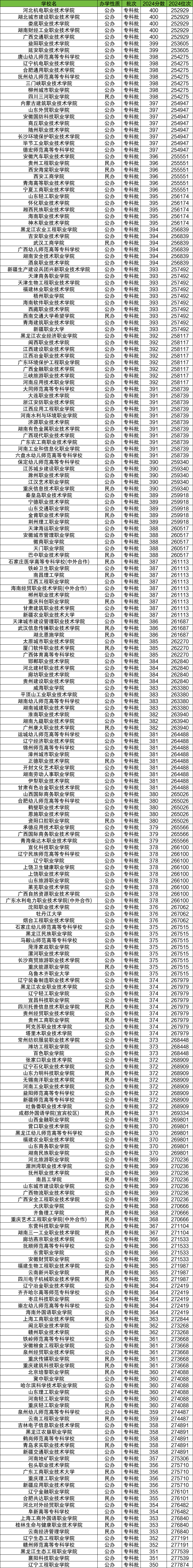 2024年文科录取分数线在350到400分能上的大学一共有321所,全部为专科学校。