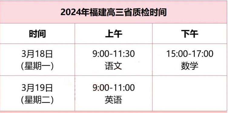 2024年福建高三省质检考试时间定于3月18日-3月19日进行,考试科目为语文、数学、英语三门科目,本次考试是学生查漏补缺的途径,为下一轮的复习提供方向。