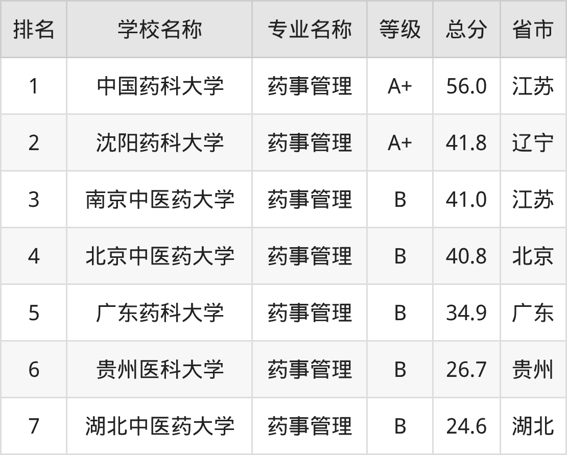 根据软科榜单可知,药事管理专业全国排名前七的大学分别是: