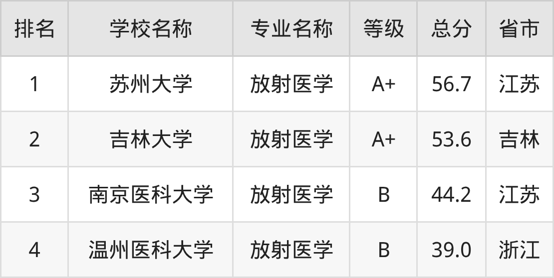 根据软科榜单可知,放射医学专业全国排名前四的大学分别是: