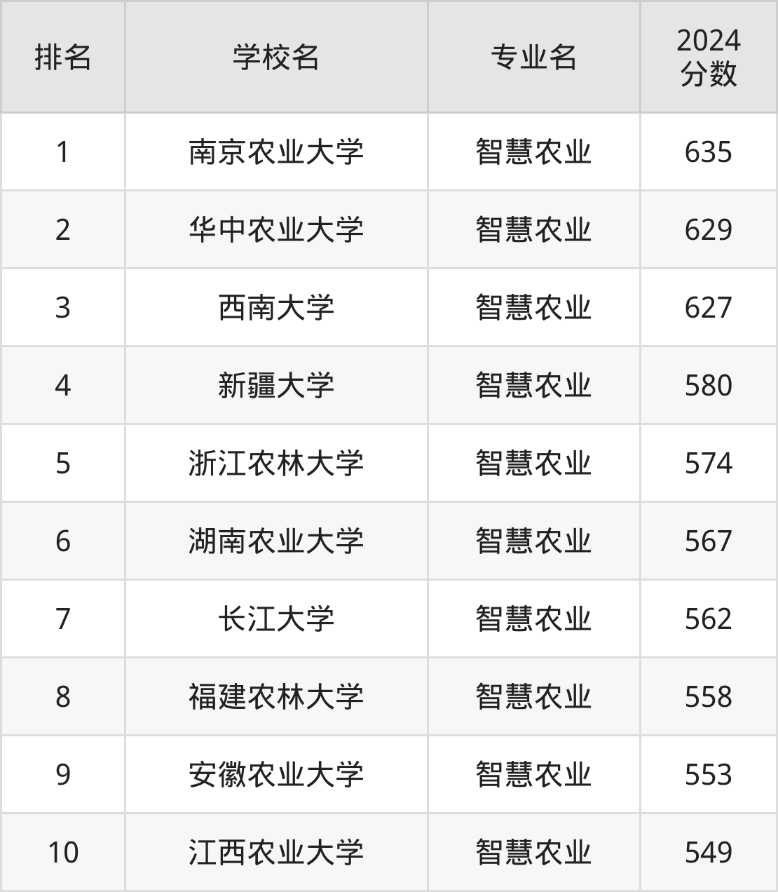 智慧农业专业排名前10的大学中,收分较低的有江西农业大学(549分)、安徽农业大学(553分)、福建农林大学(558分)、长江大学(562分)、湖南农业大学(567分)。