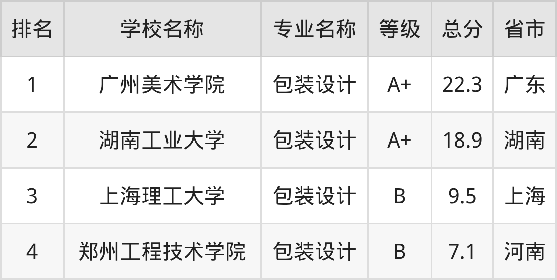 2025年包装设计专业全国大学排名中,排名第一的是广州美术学院,被软科榜单评为:包装设计专业实力最强的本科院校。本文将展示包装设计专业上榜软科榜单的4所院校排名以及等级评分,供2026年想读包装设计专业的同学们参考!