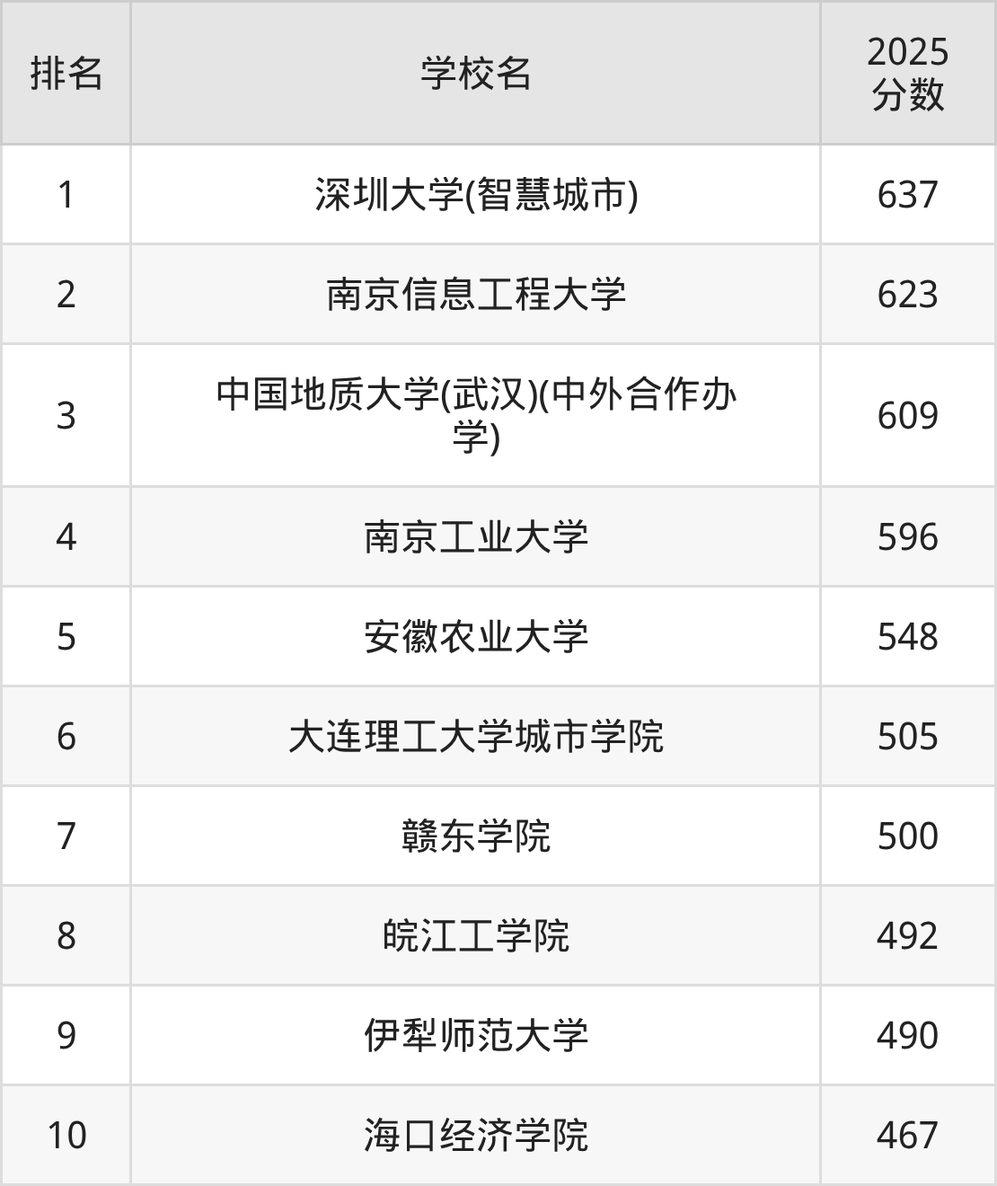 地理空间信息工程专业排名前10的大学中,收分较低的有海口经济学院(467分)、伊犁师范大学(490分)、皖江工学院(492分)、赣东学院(500分)、大连理工大学城市学院(505分)。