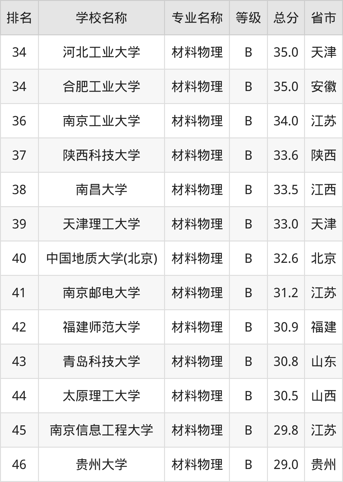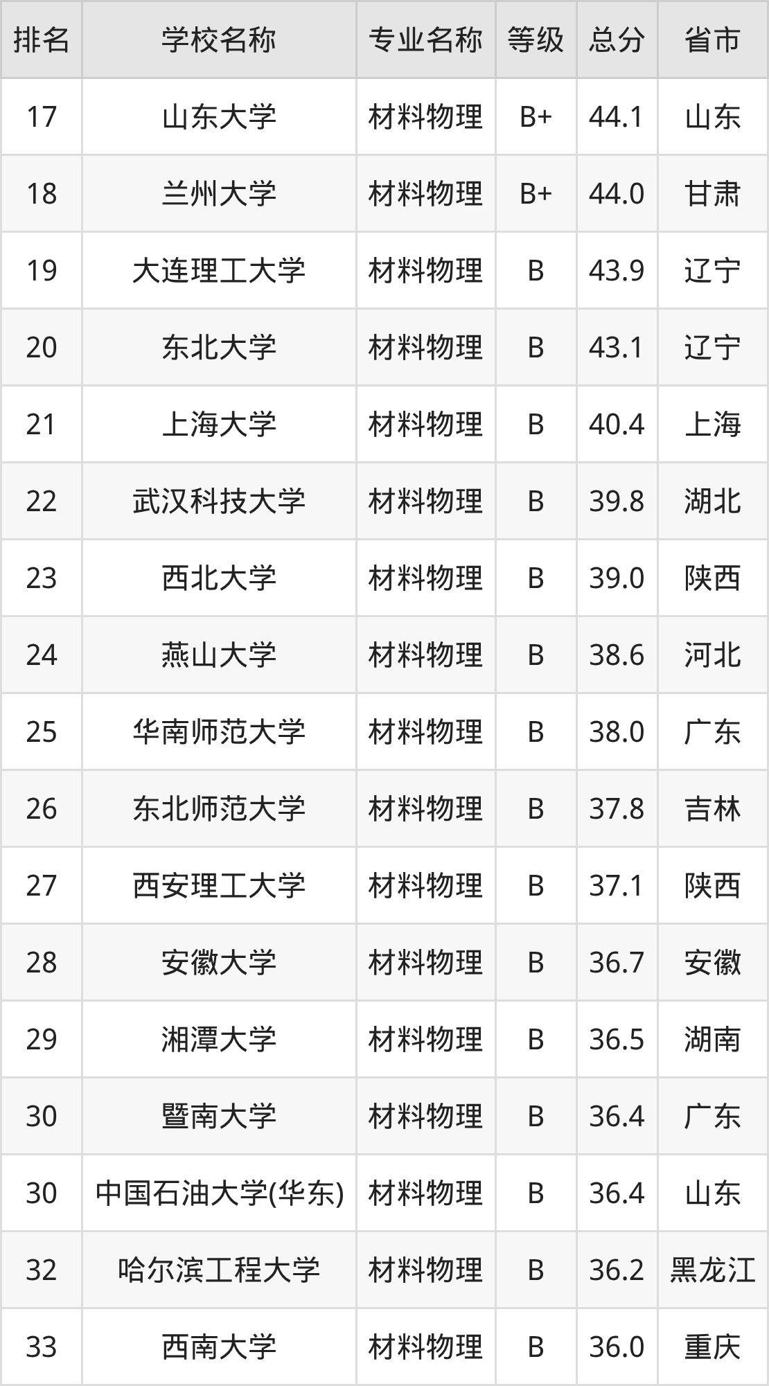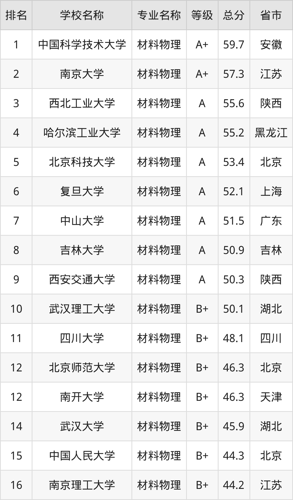 根据软科榜单可知,材料物理专业全国排名前十的大学分别是: