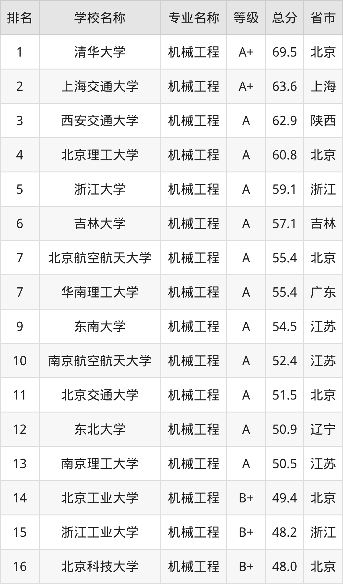 根据软科榜单可知,机械工程专业全国排名前十的大学分别是: