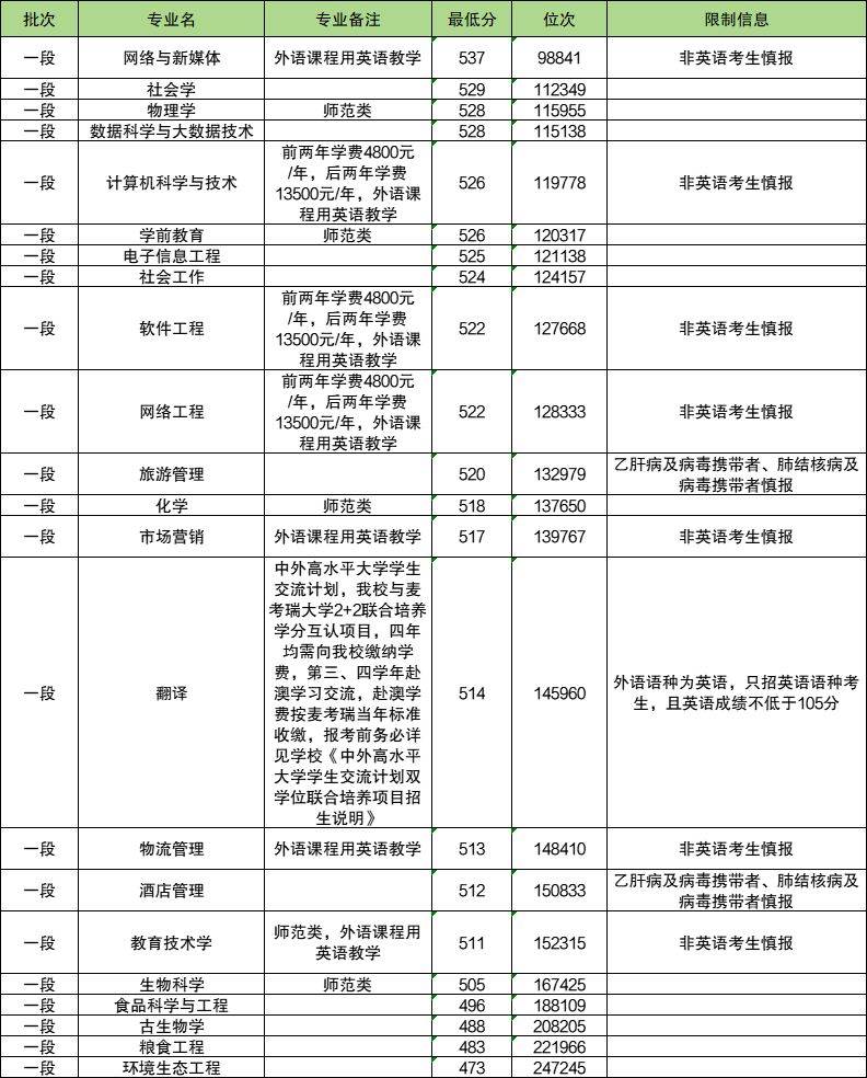 计算机科学与技术专业(师范类,外语课程用英语教学):最低537分。非英语考生慎报。