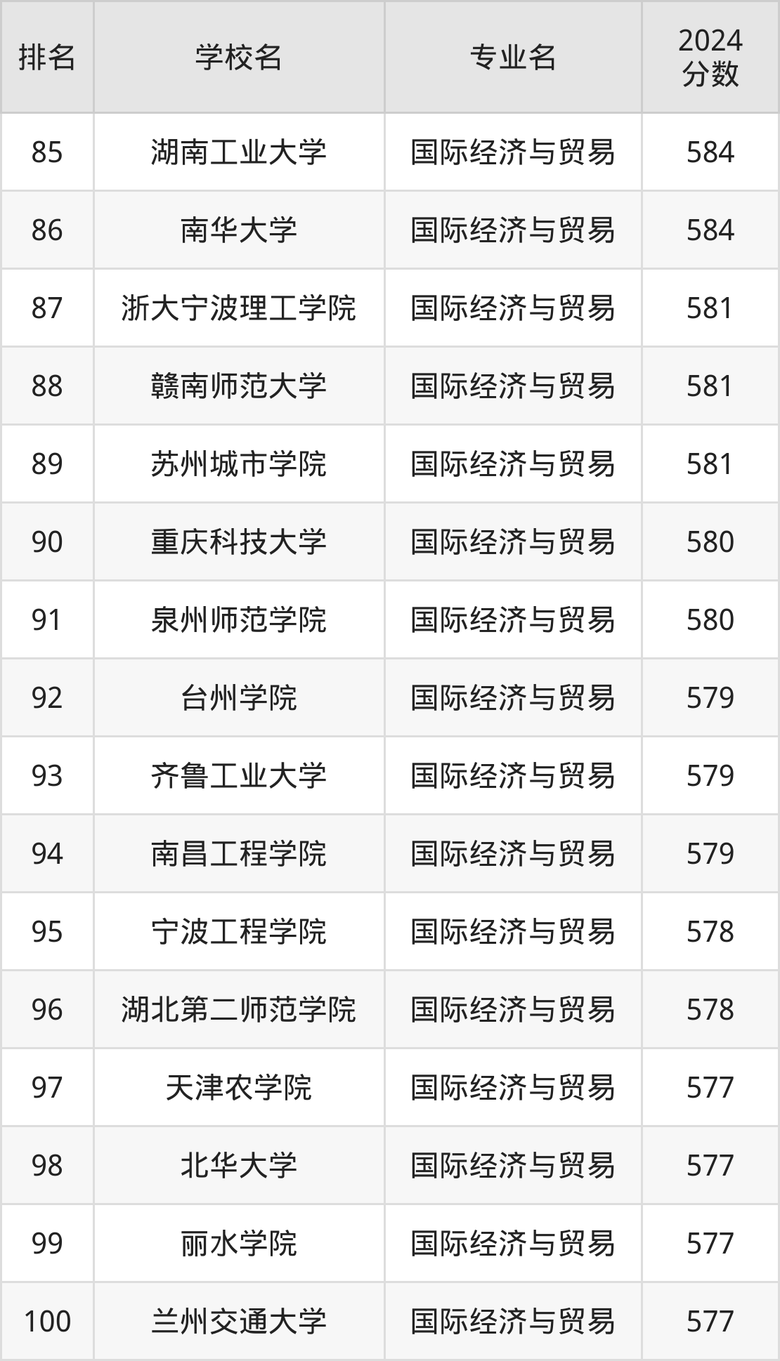 以下为全国国际经济与贸易专业在浙江省分数线排名前100的大学。