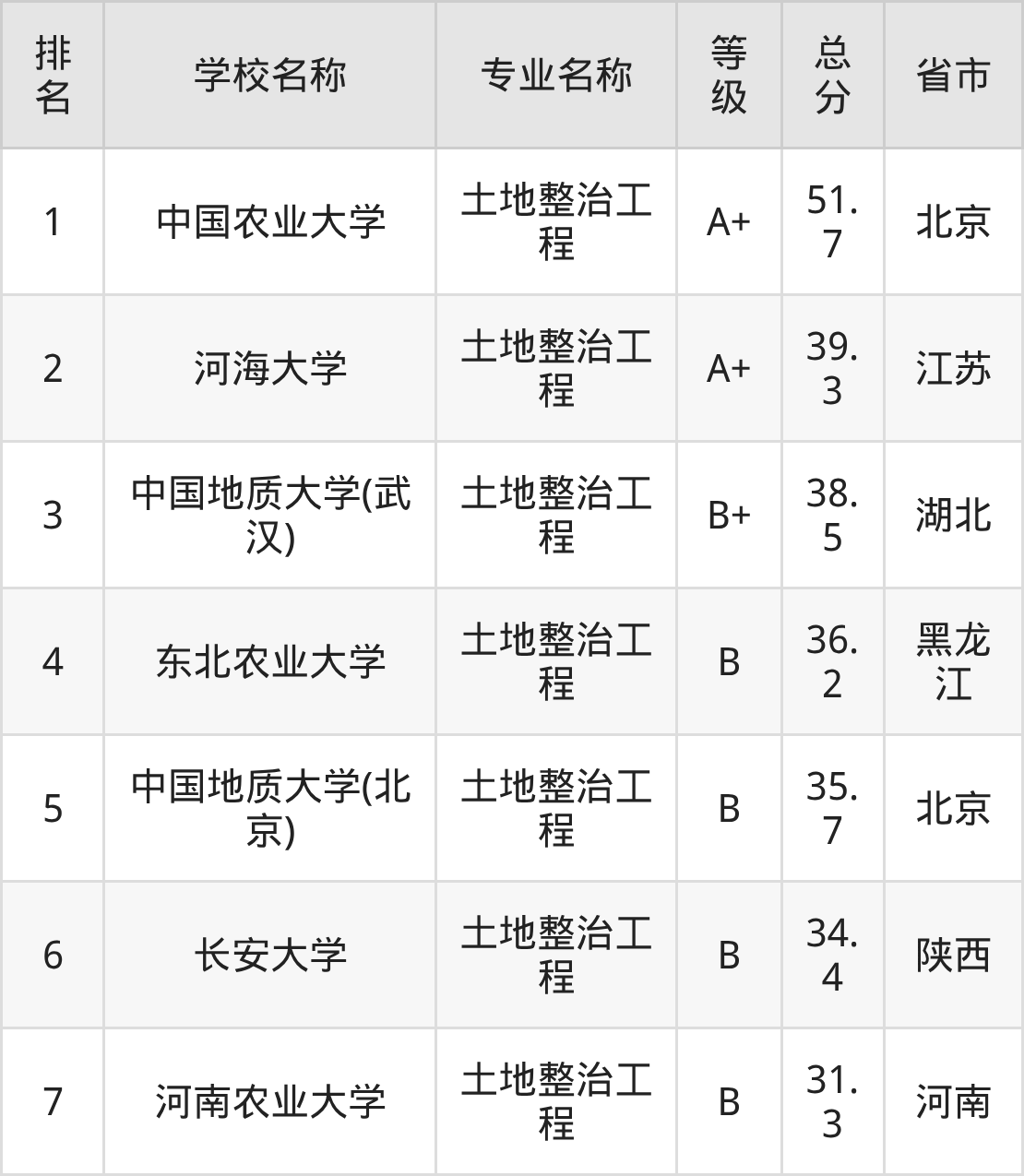 根据软科榜单可知,土地整治工程专业全国排名前七的大学分别是: