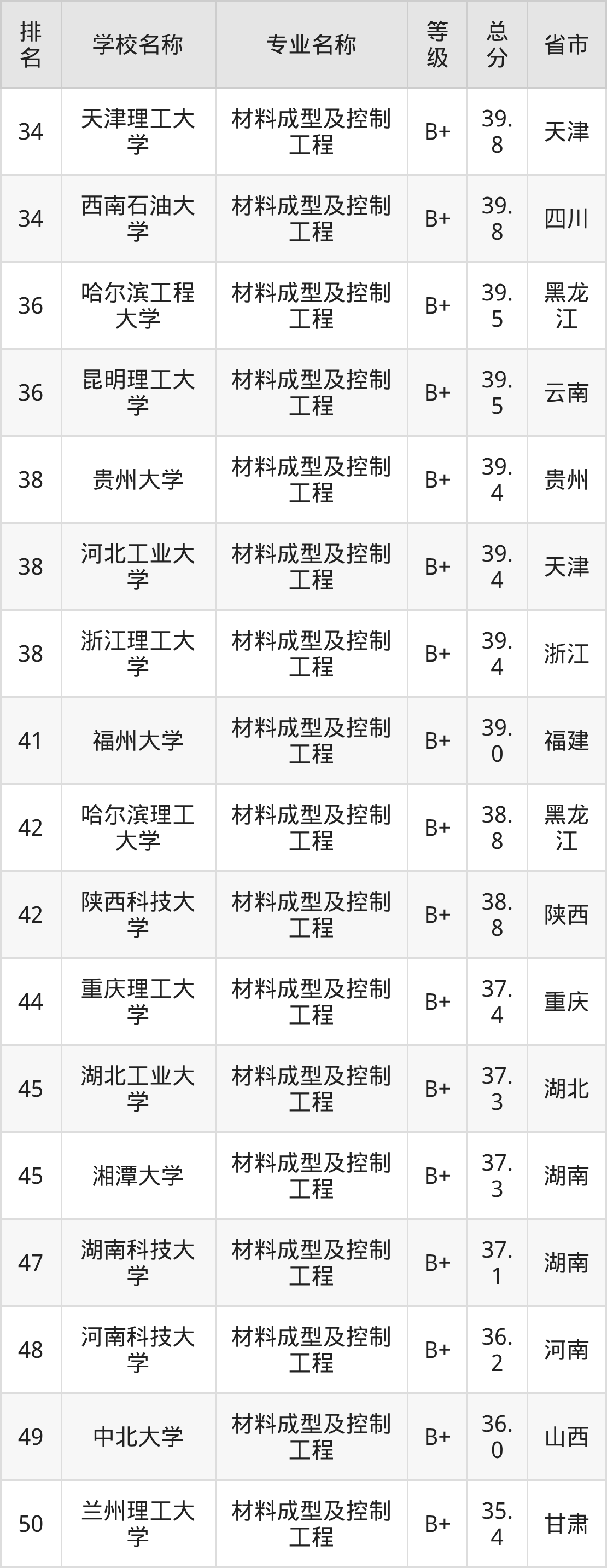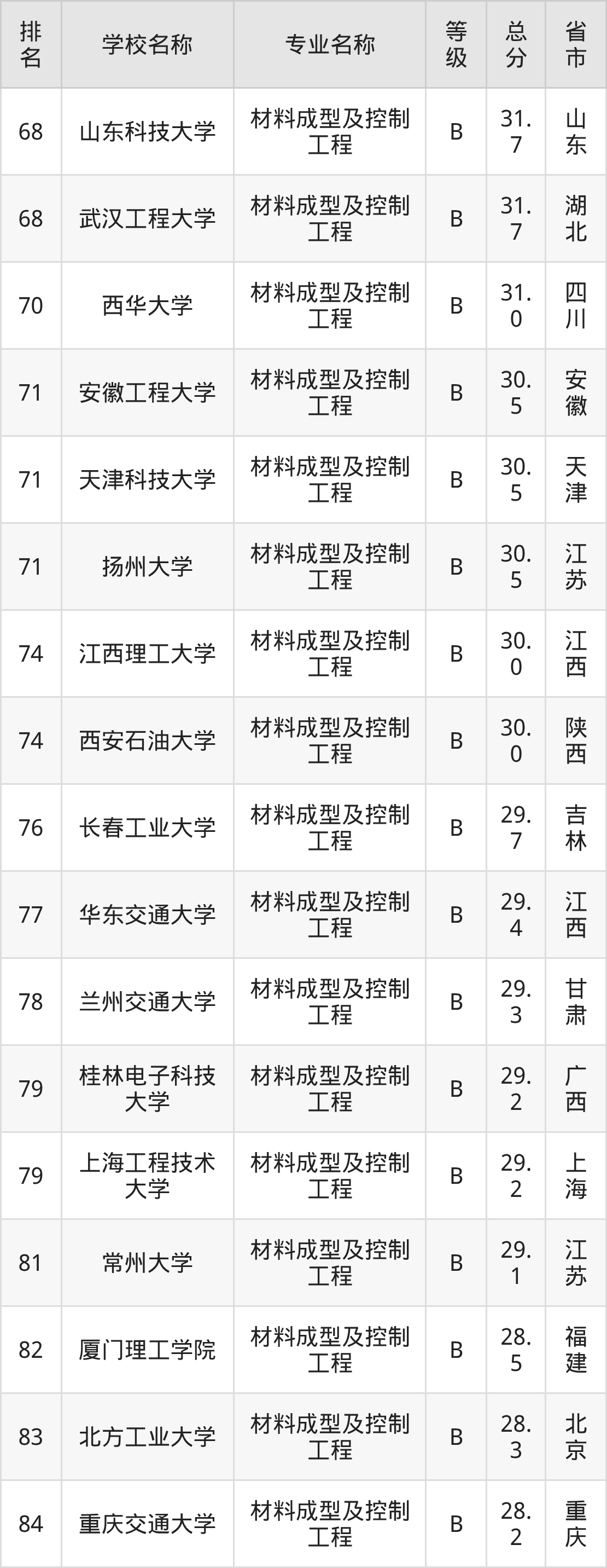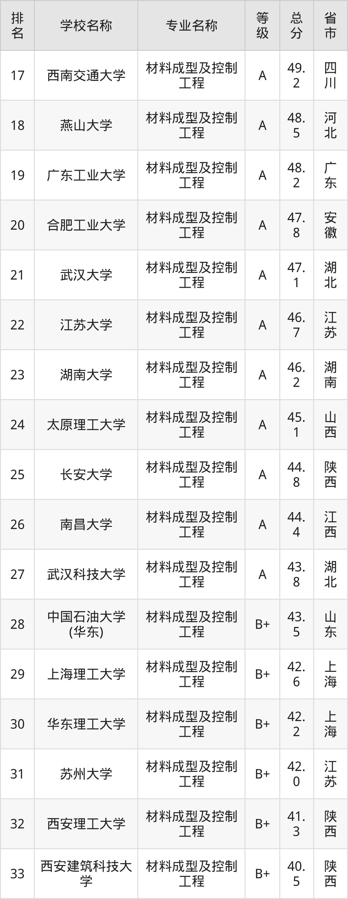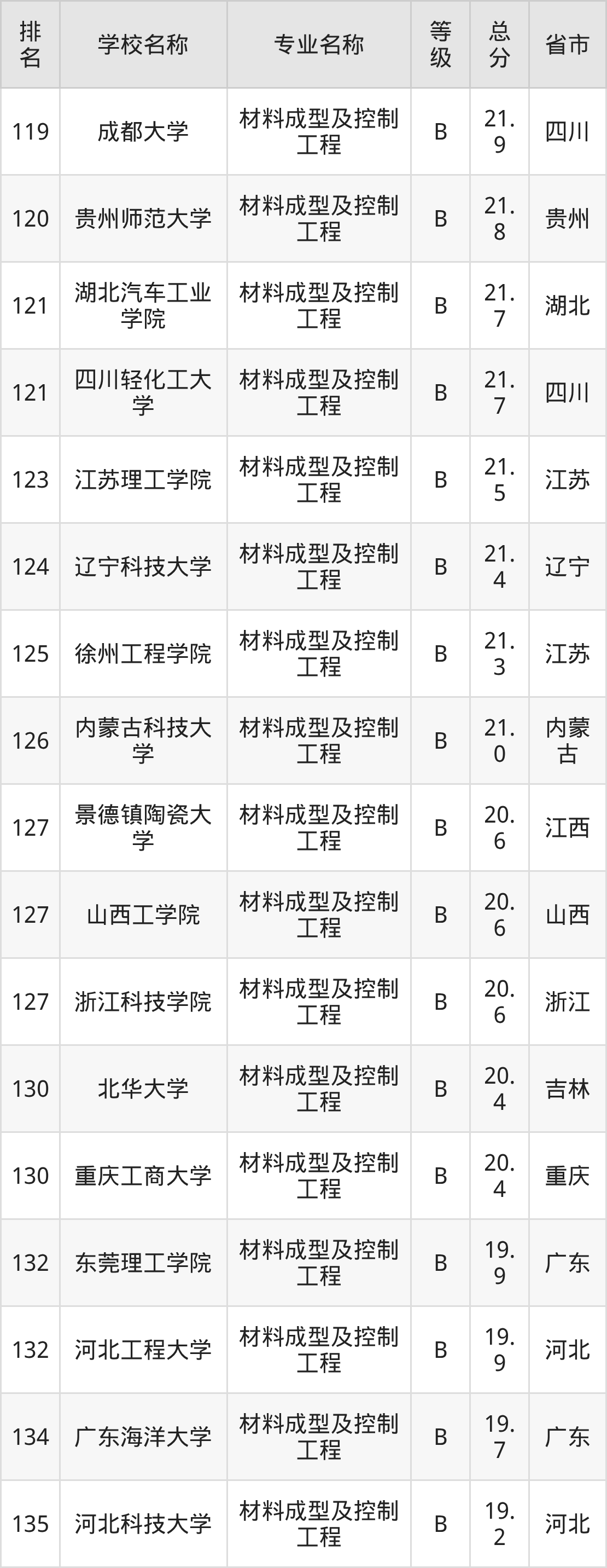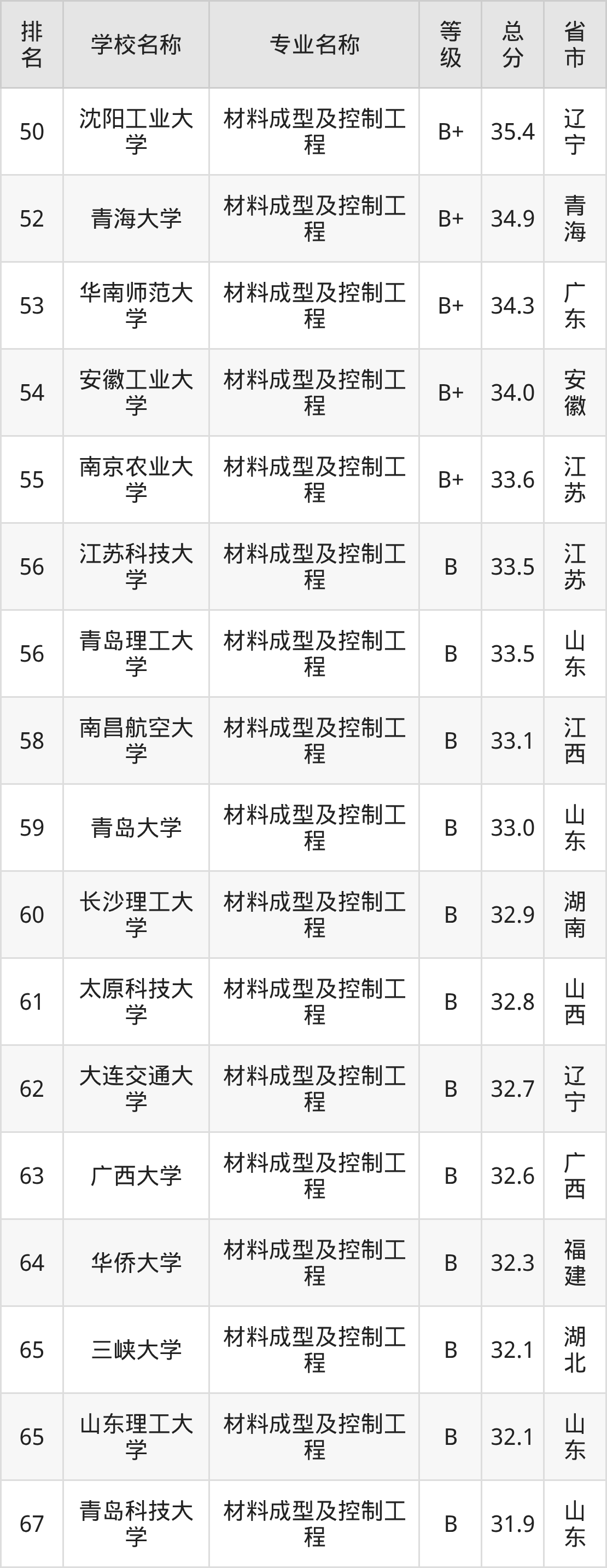 附材料成型及控制工程专业全国139所院校排名榜单一览表!