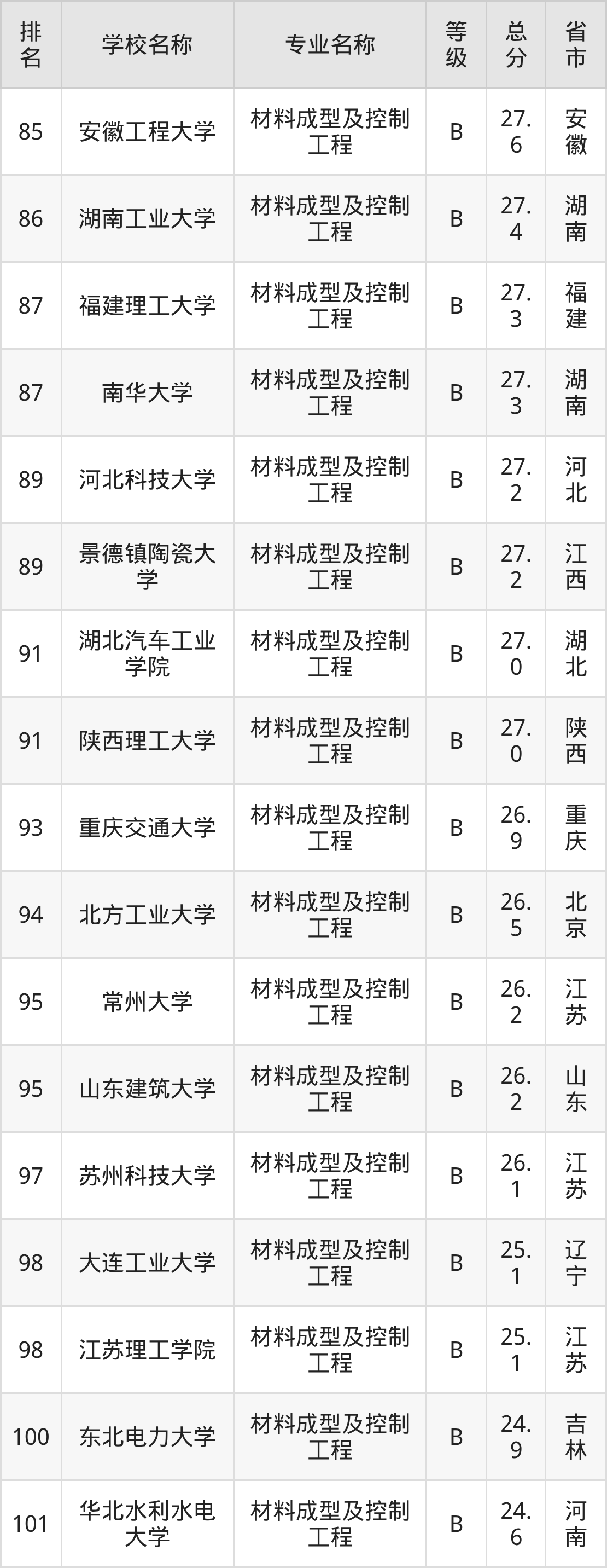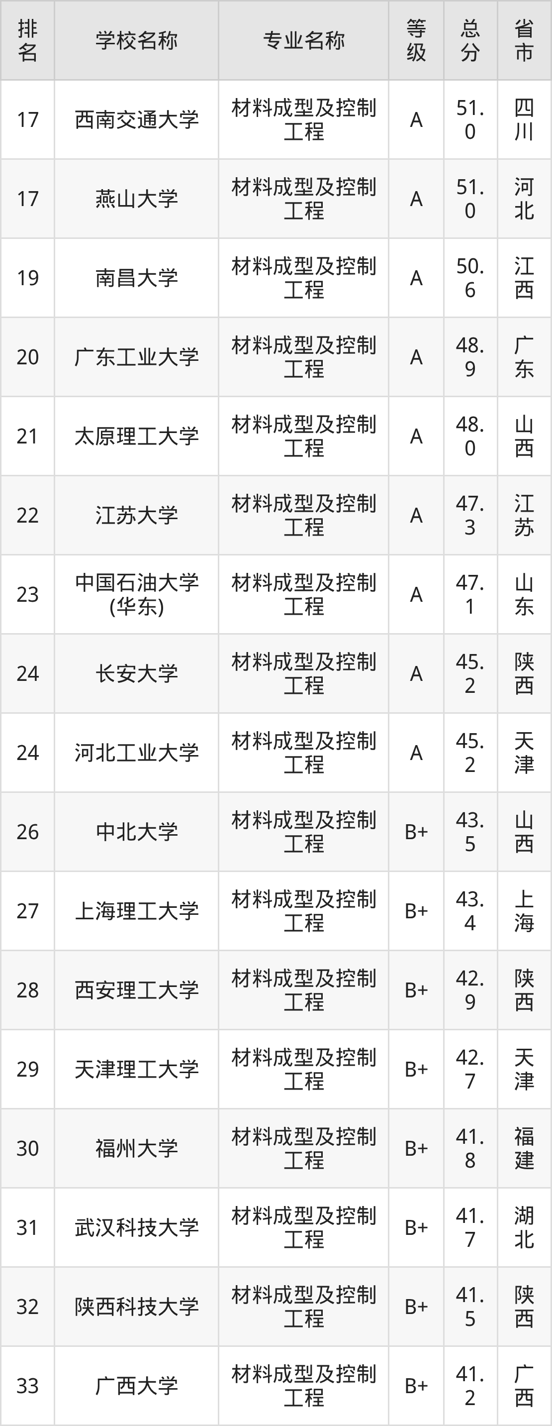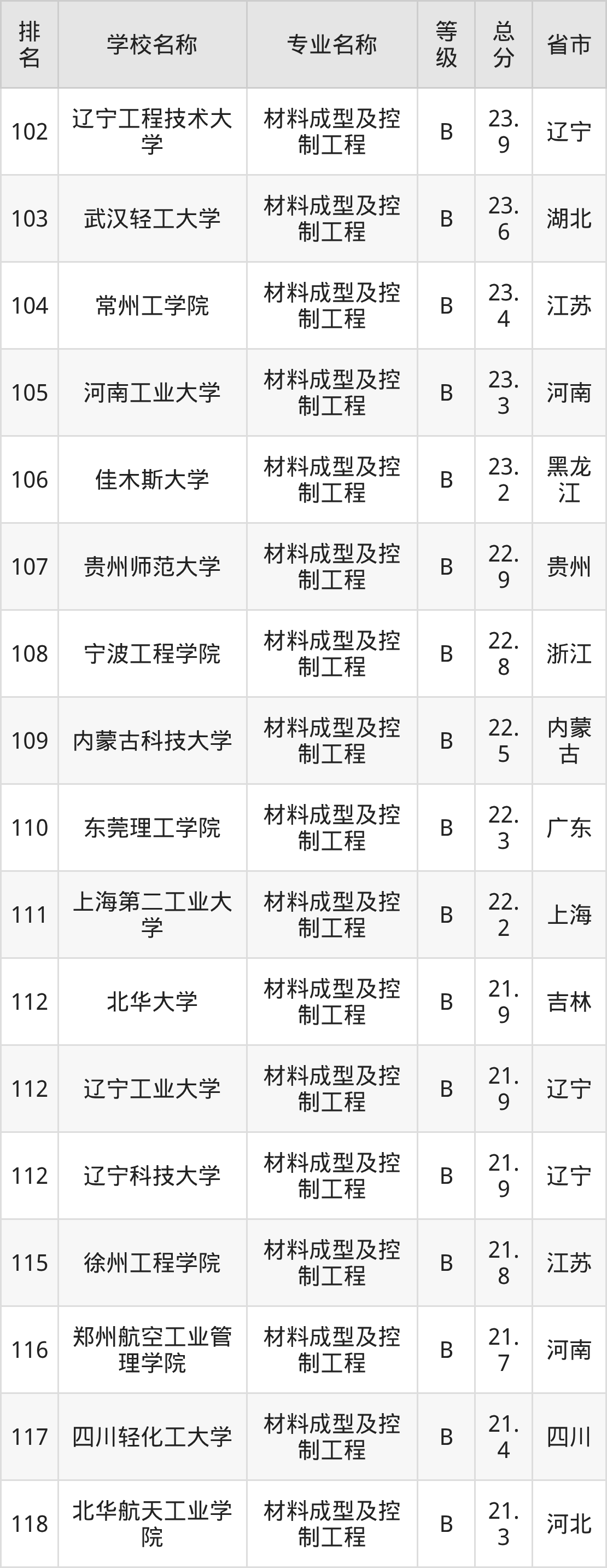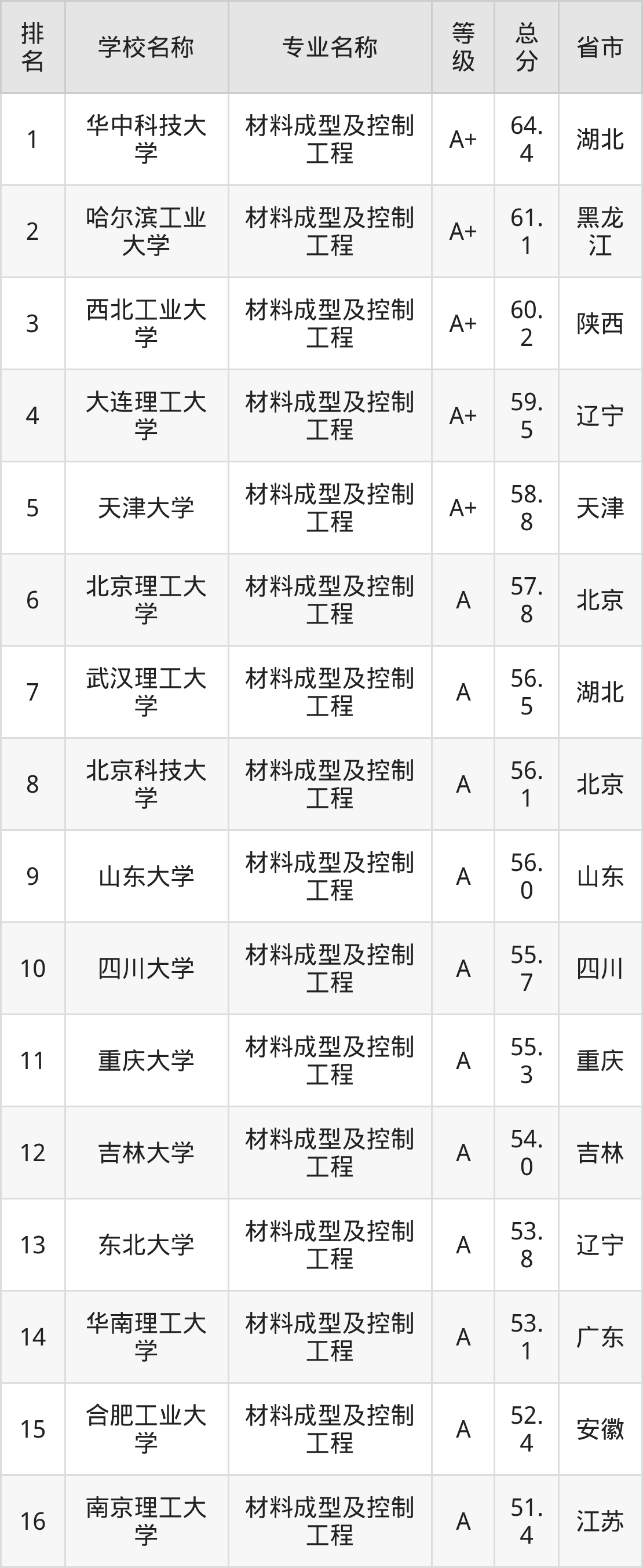 附材料成型及控制工程专业全国127所院校排名榜单一览表!
