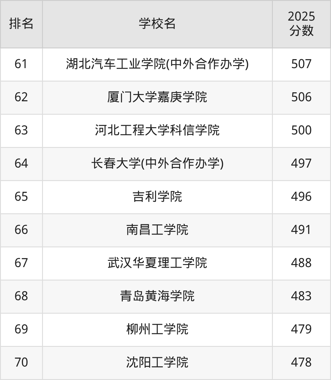 车辆工程专业排名前70的大学中,收分较低的有三亚学院(467分)、长春工业大学人文信息学院(476分)、西安交通工程学院(477分)、兰州博文科技学院(477分)、沈阳工学院(478分)。