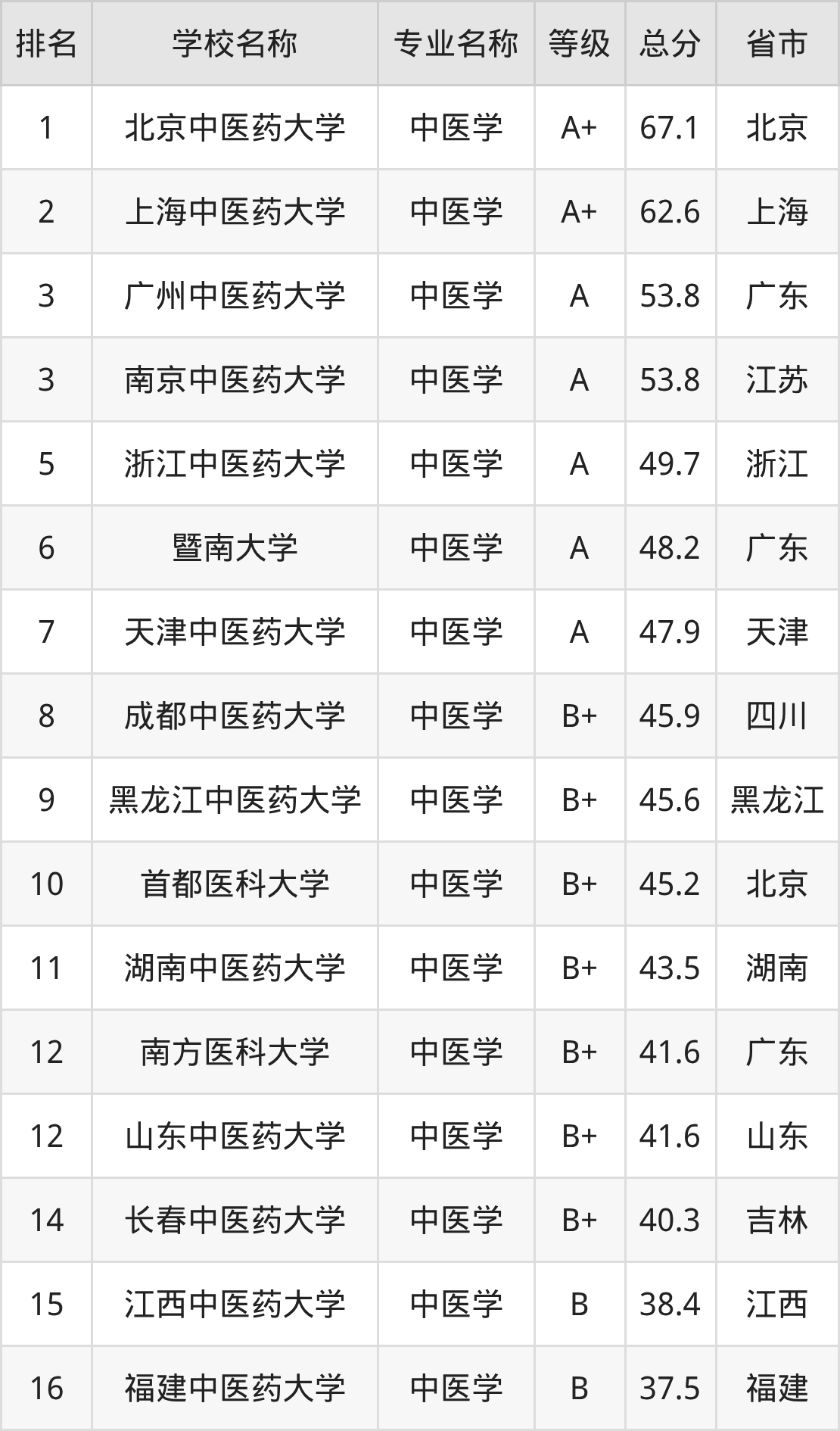 根据软科榜单可知,中医学专业全国排名前十的大学分别是: