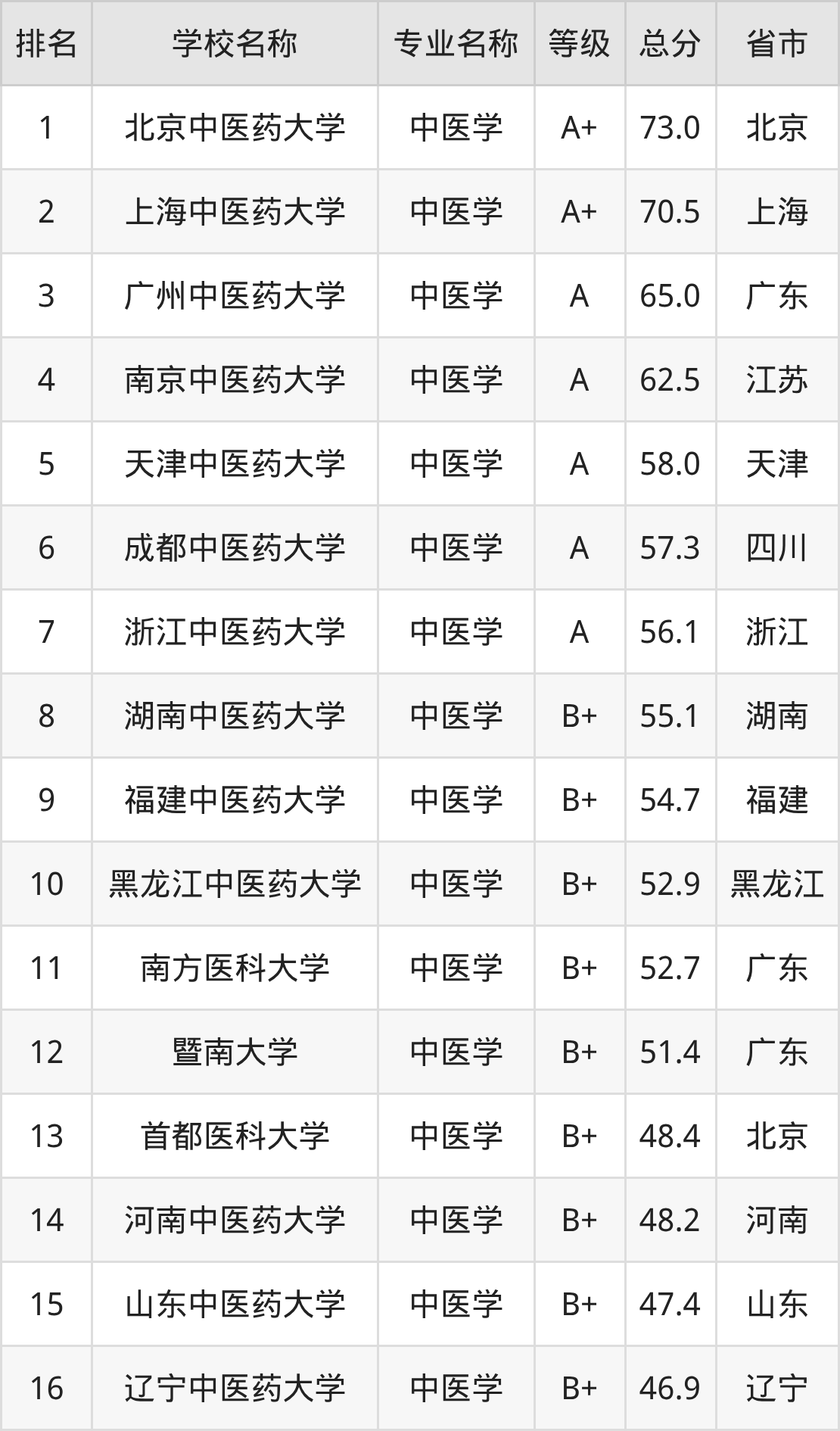 北京中医药大学:第1名,评分为73.0